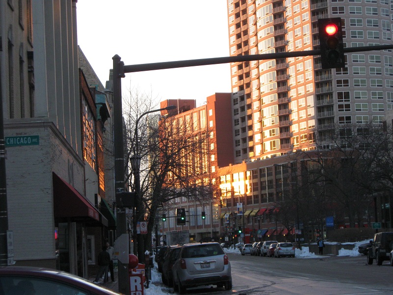 Sun reflecting on parking garage and Sherman Plaza looking west on Davis Street