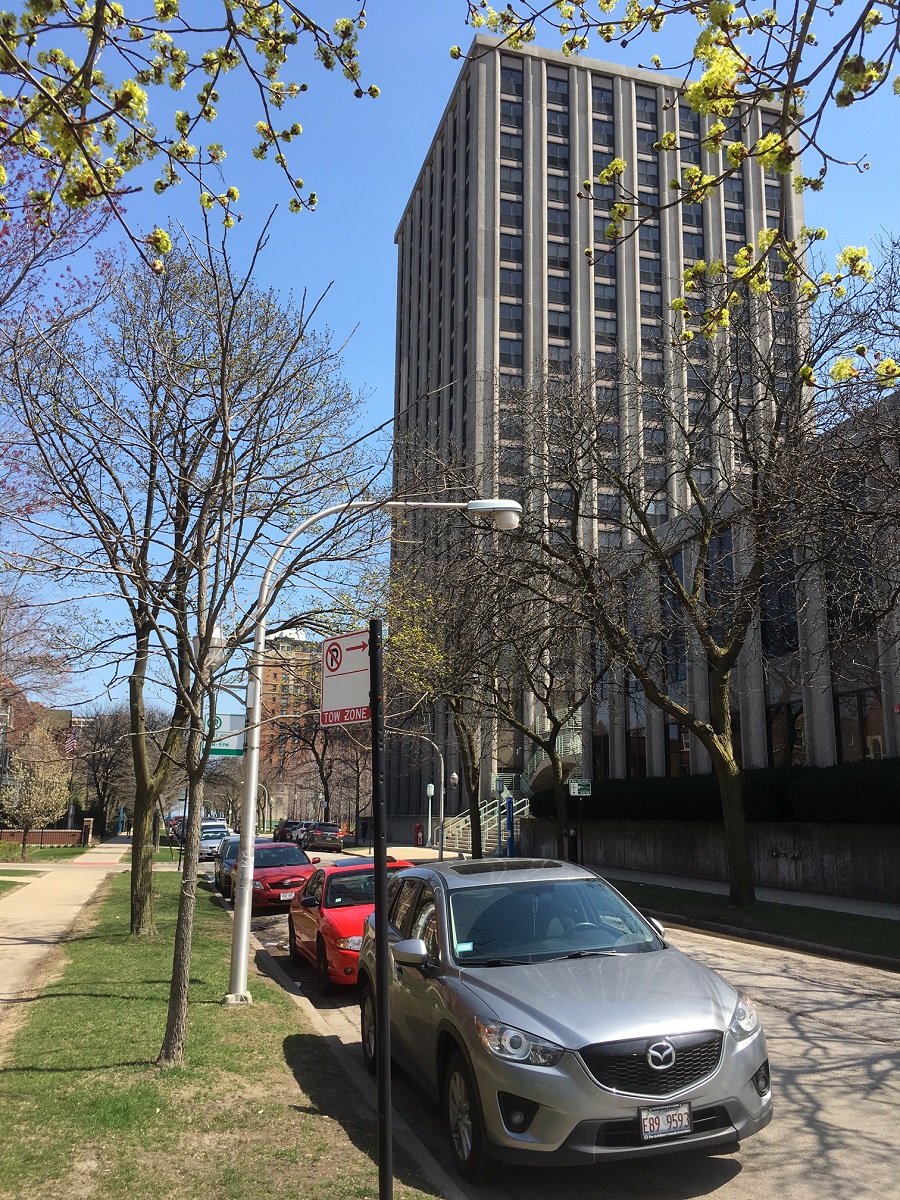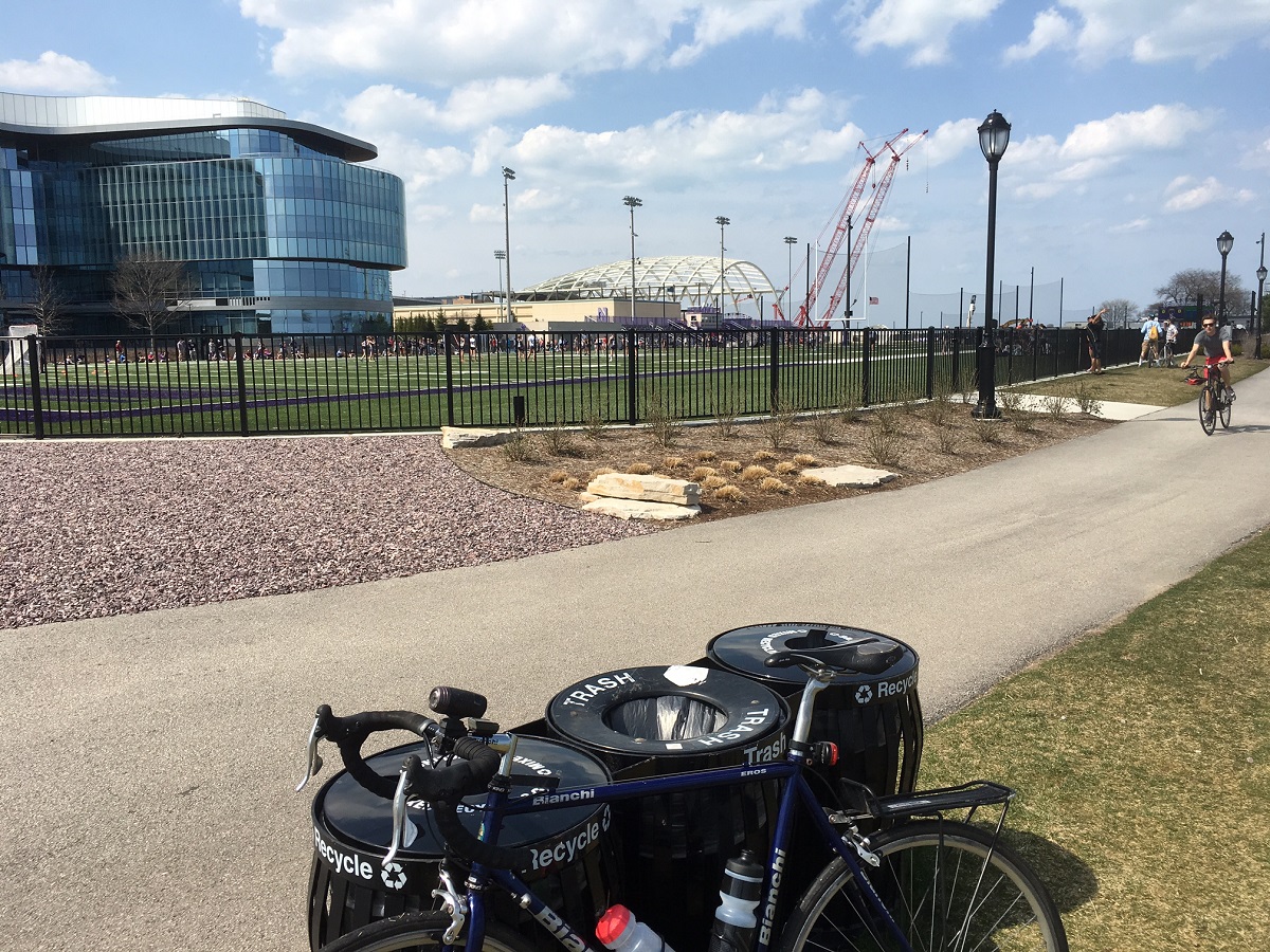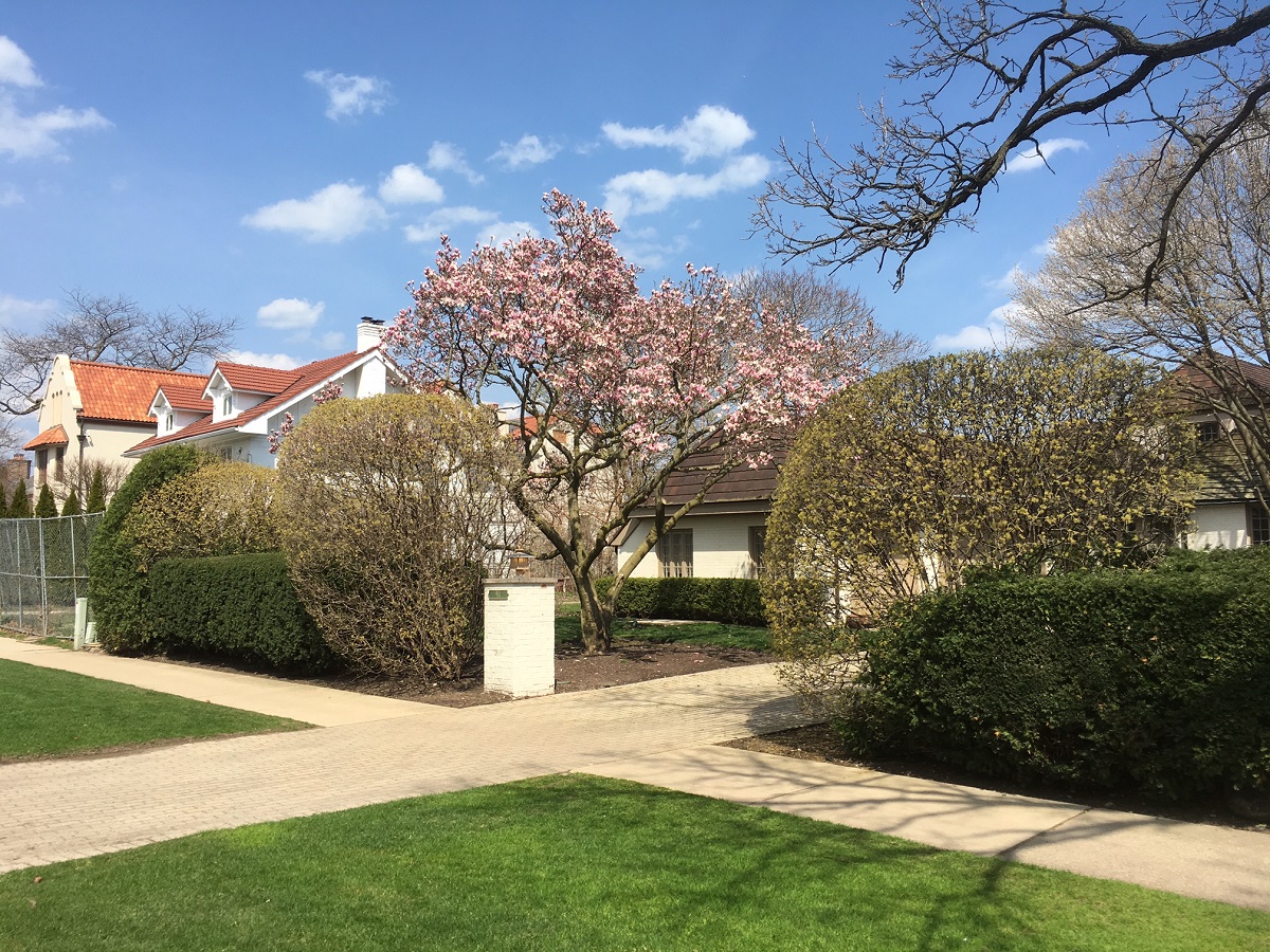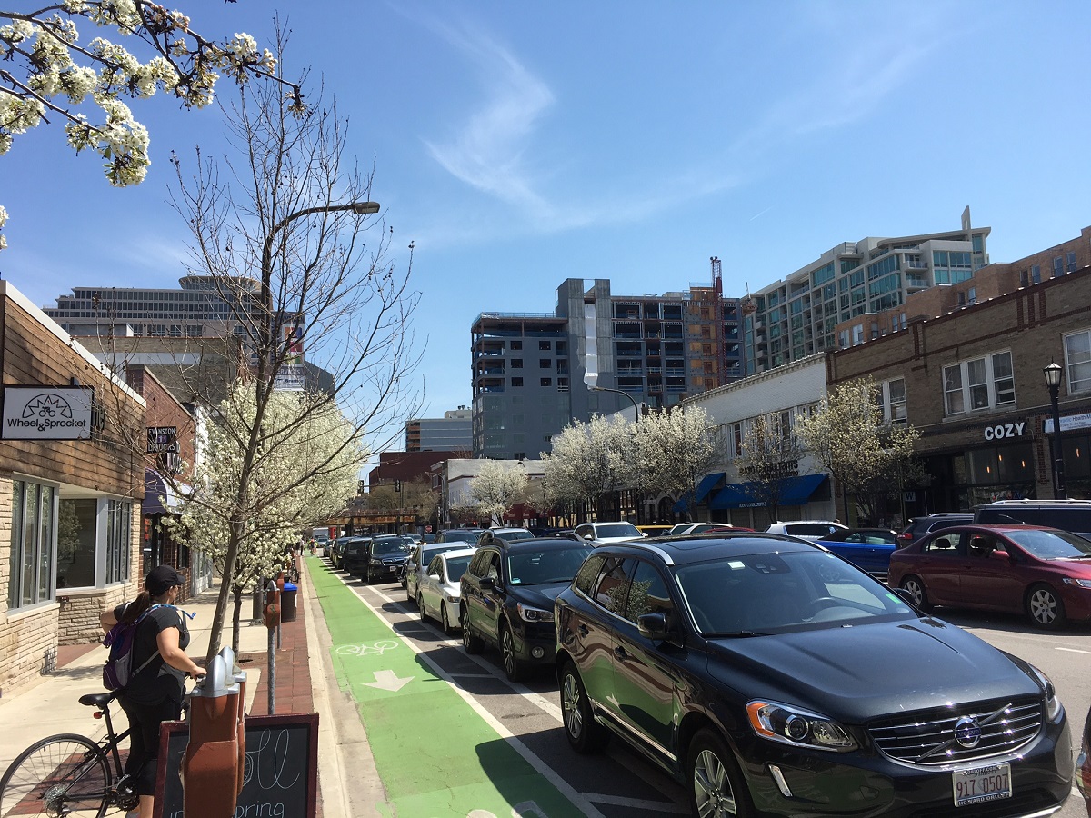 Crabapple trees in bloom with bike lane along Davis Street, Evanston