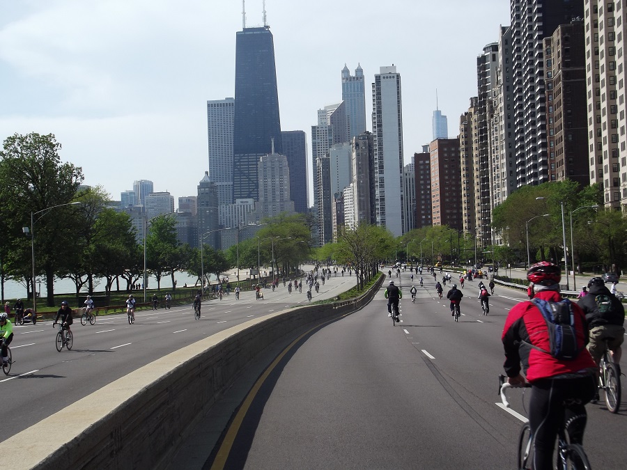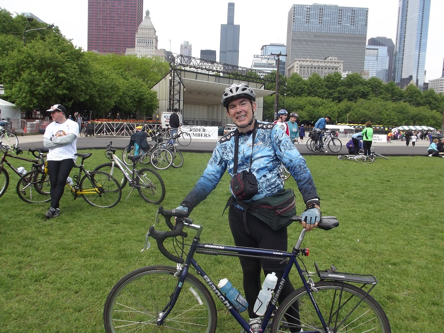 Andy with his bike in Grant Park with Willis Tower at end of Bike the Drive