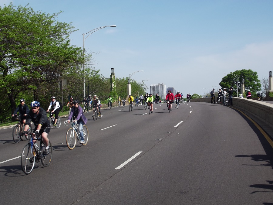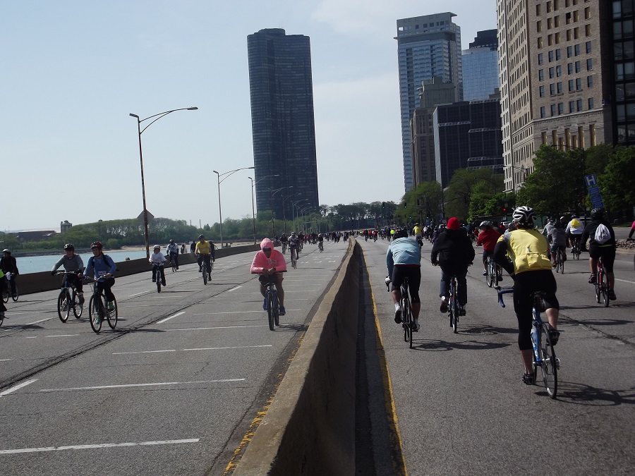 Looking around back north at many southbound cyclists coming toward us