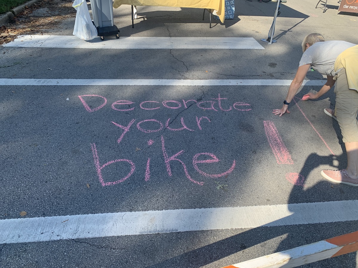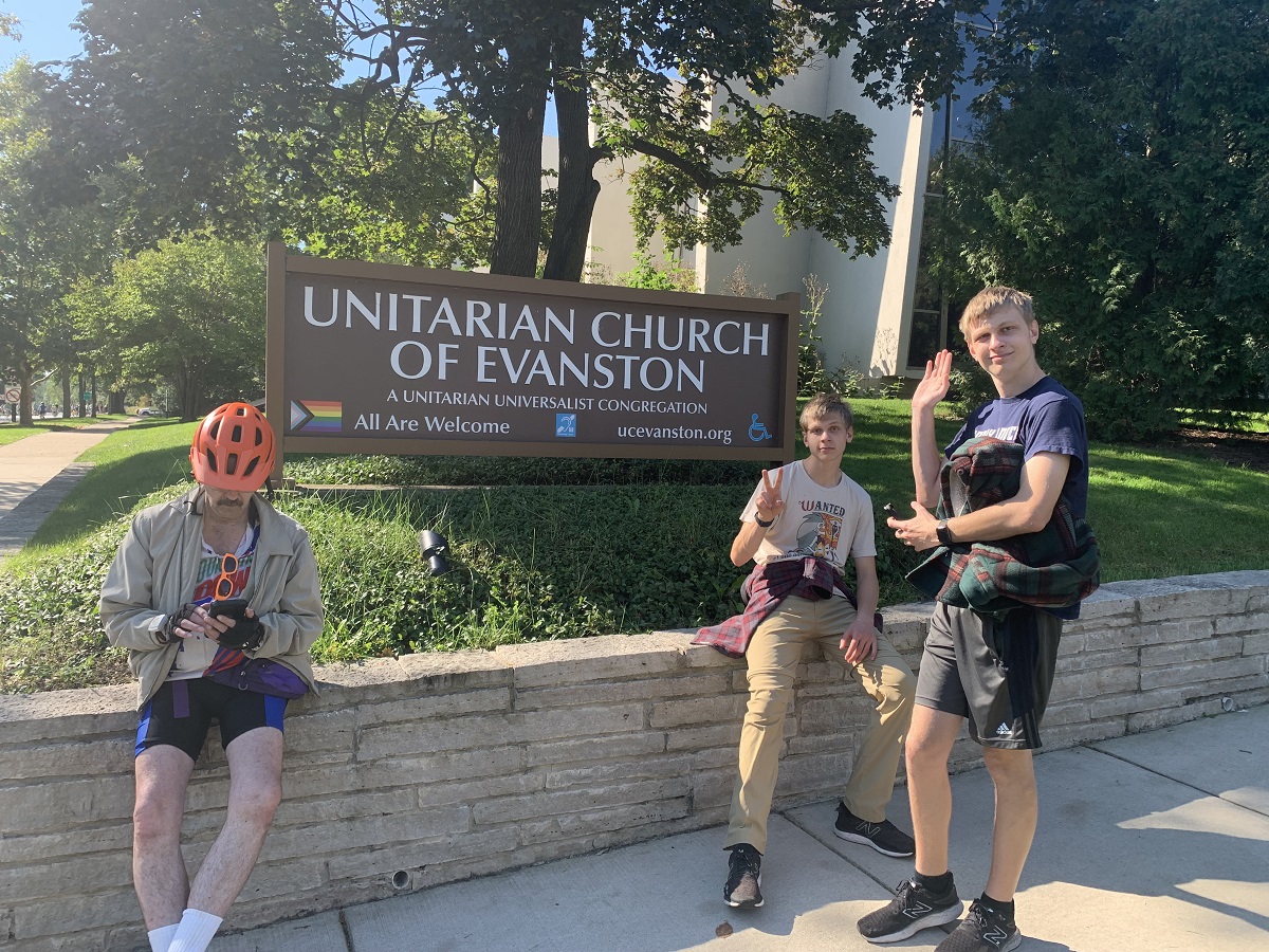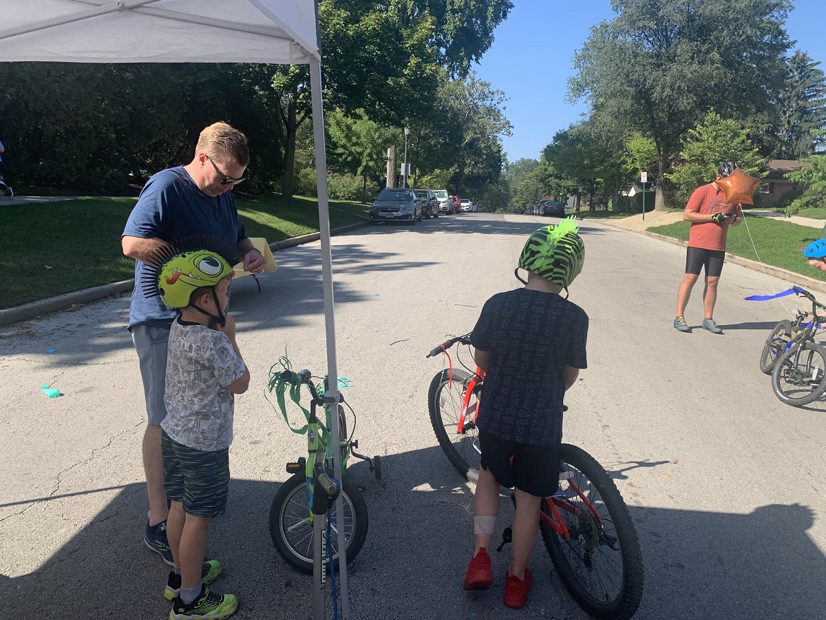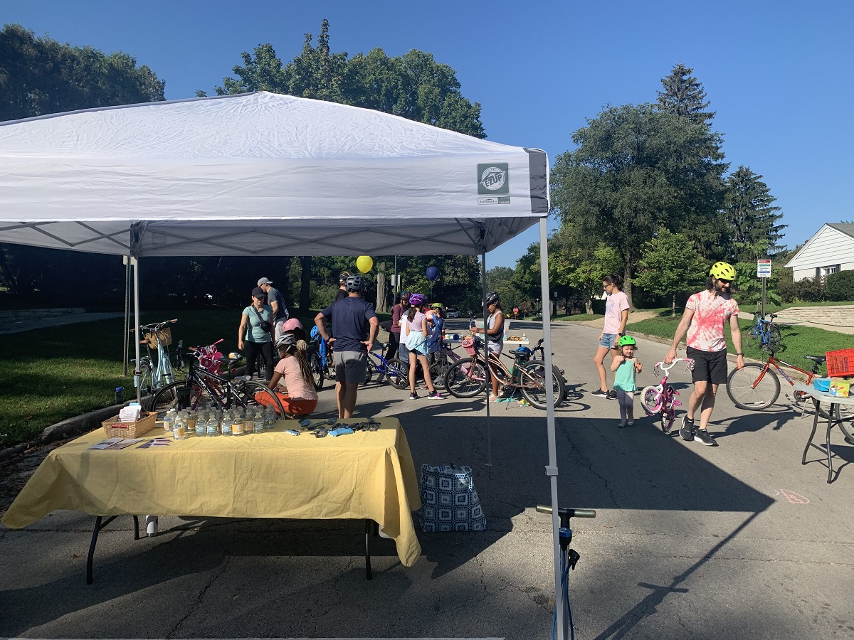 Unitarian Church of Evanston (UCE) tent for water and candy, plus decorate bike table
