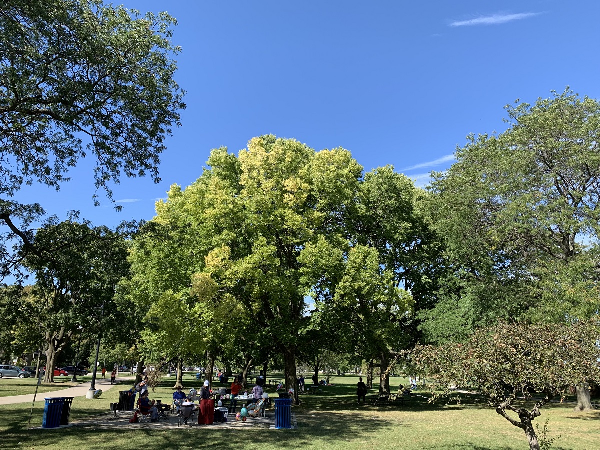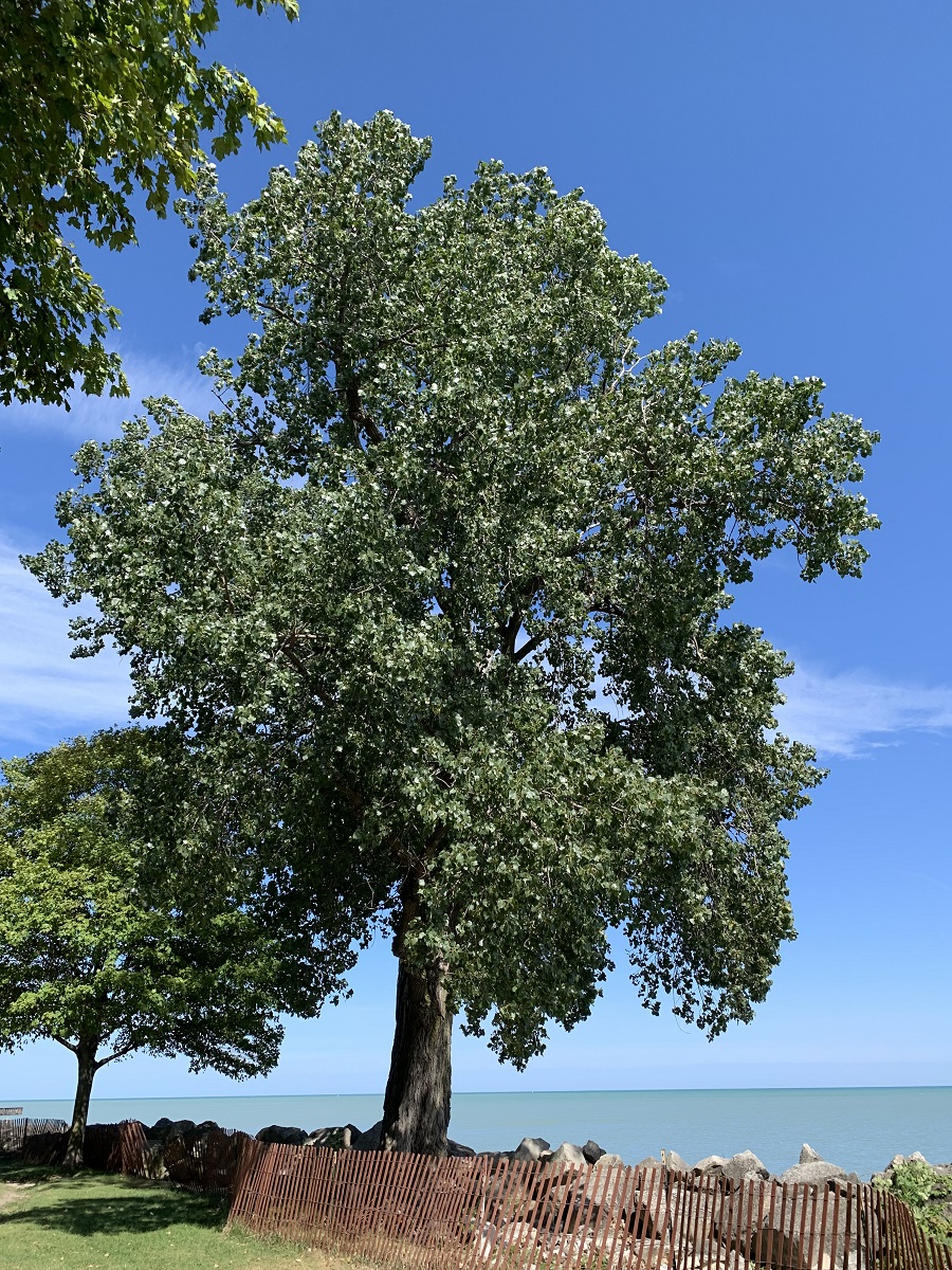 Tall cottonwood tree on lakeshore south of Dempster St.