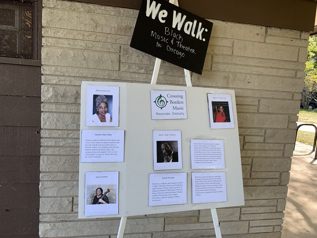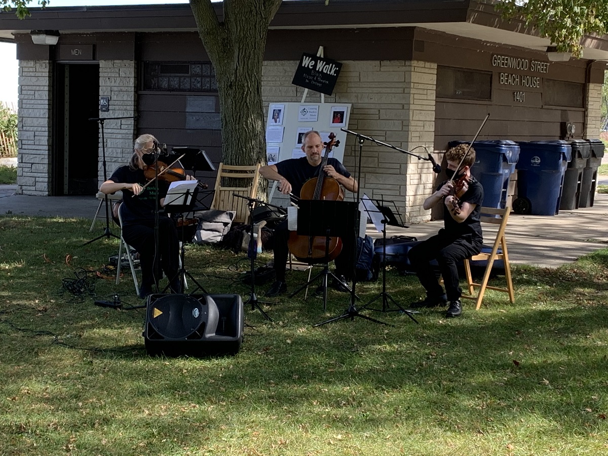 String quartet playing by "We Walk" signs