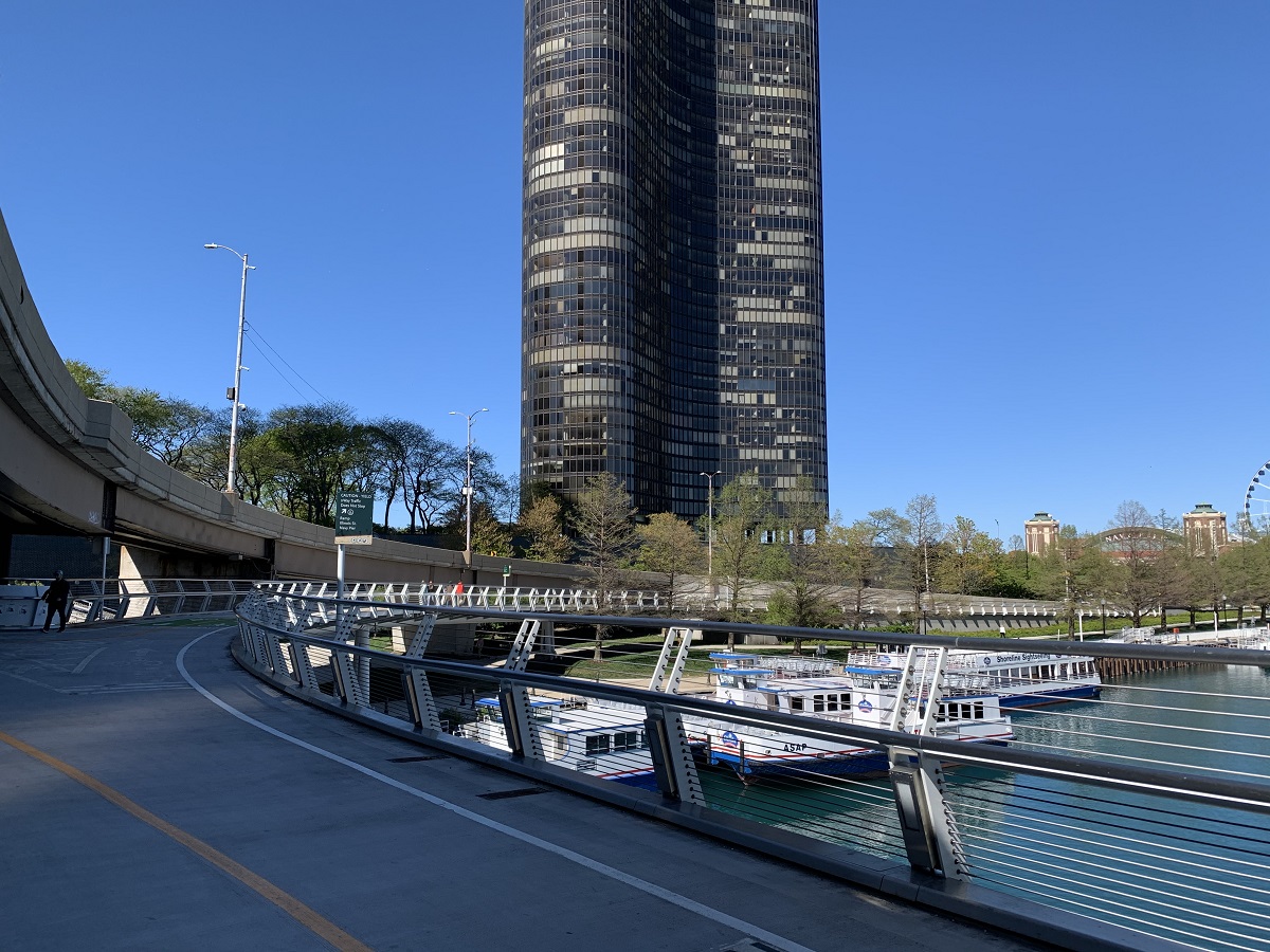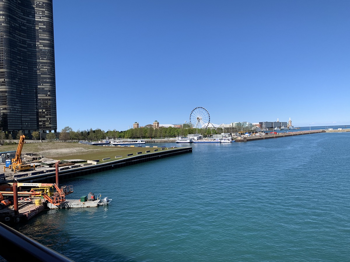 Lake Point Tower and Navy Pier from the fly over bridge in the middle of the Chicago River