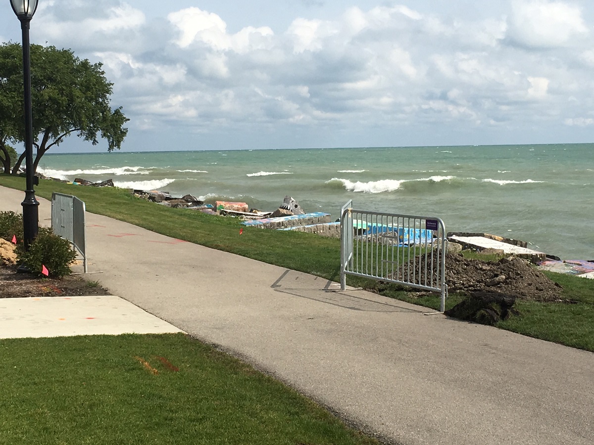 Downtown Chicago under tree tunnel, and large waves breaking at right