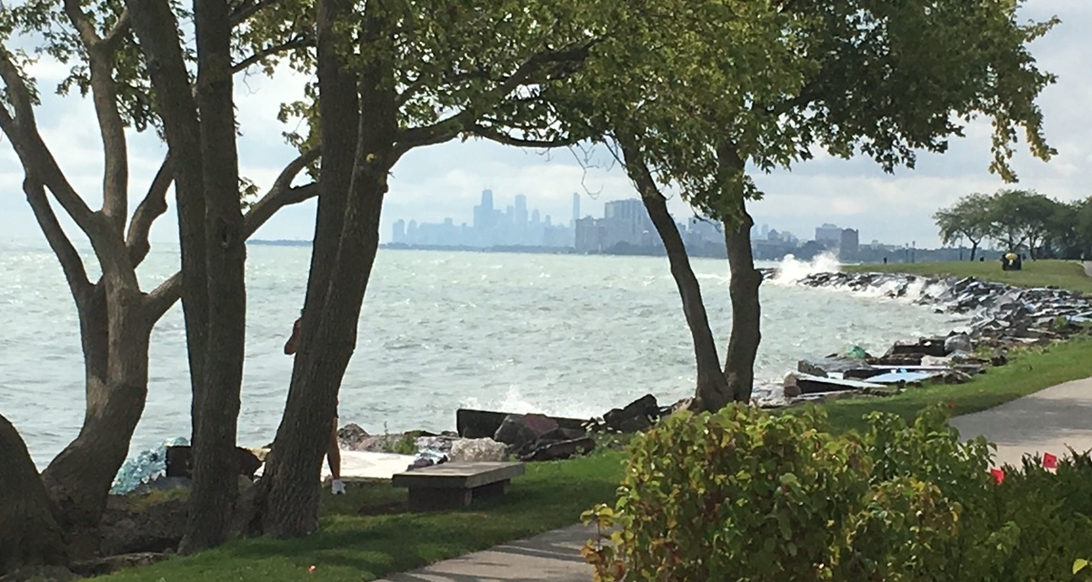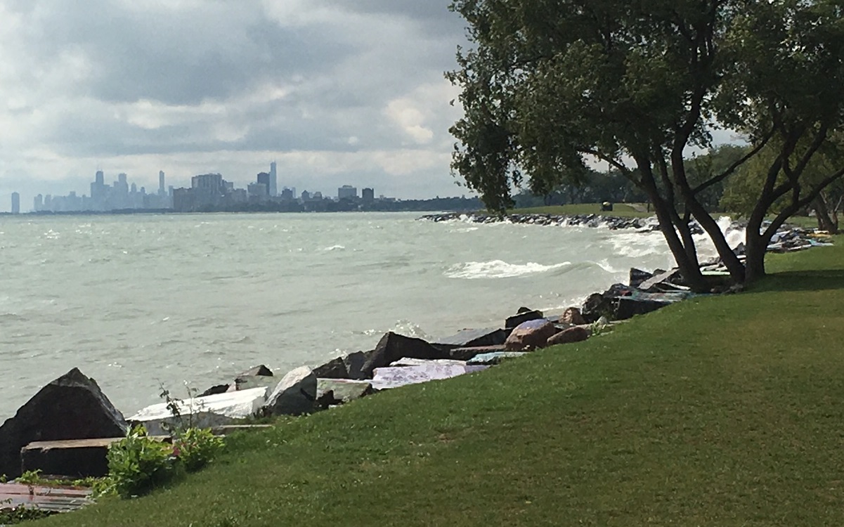Downtown Chicago from far northeast point of Northwestern landfill showing large waves on Lake Michigan breaking from fast northeast wind