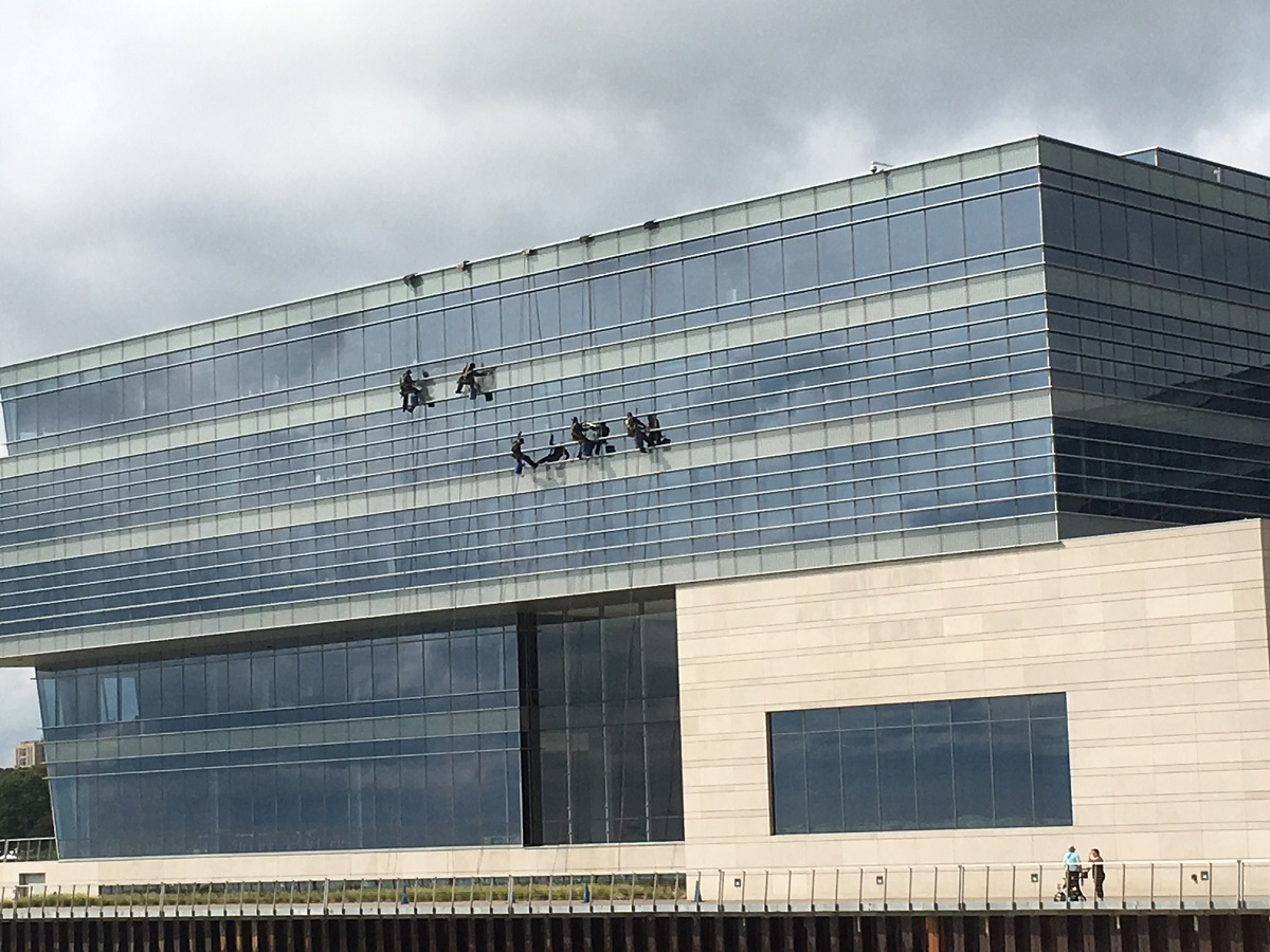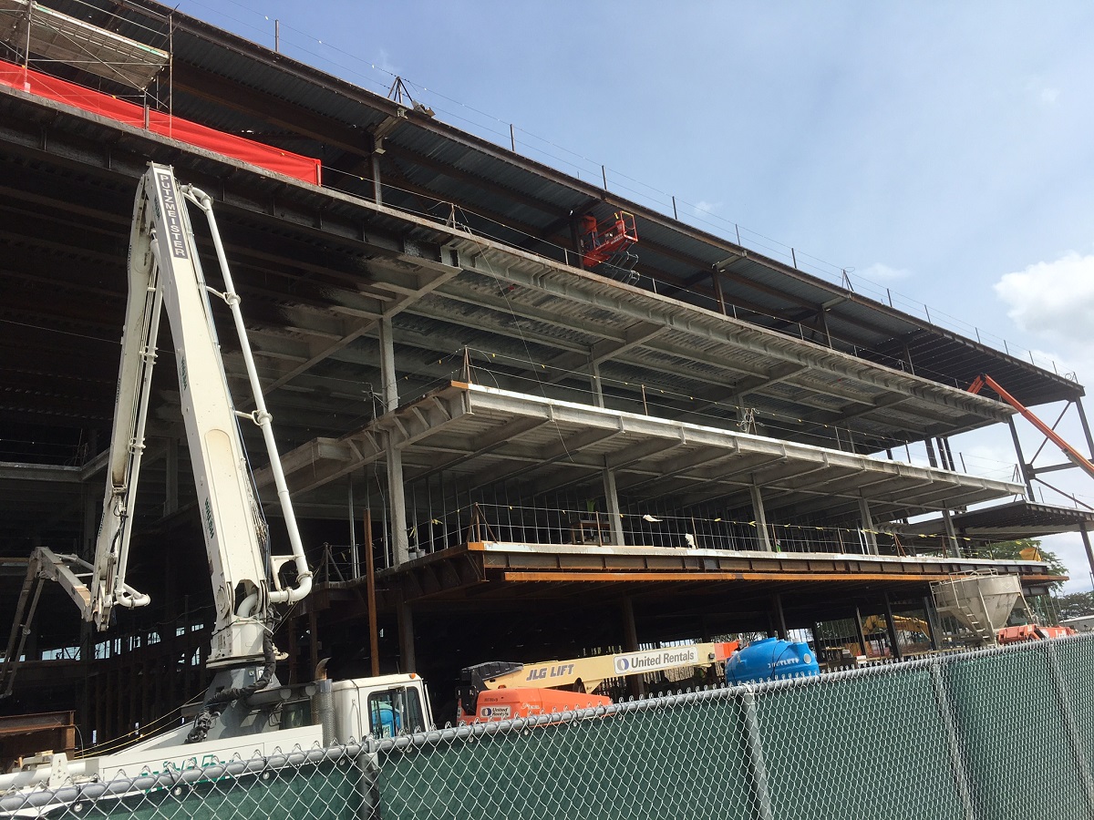 The east wall of new fieldhouse/sports center showing partly completed glass windows