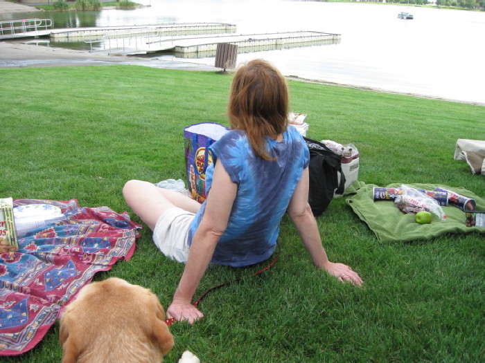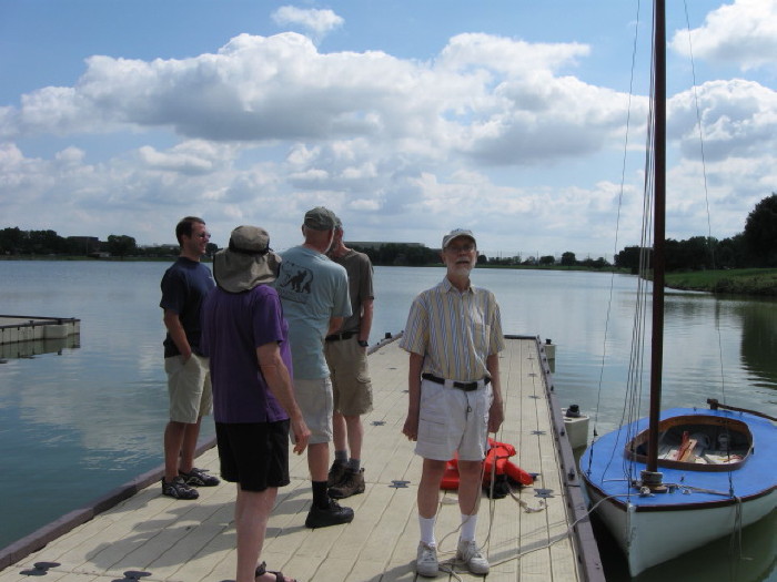 Backs of Tony and Dick, Bill Fischer at right, sailboat