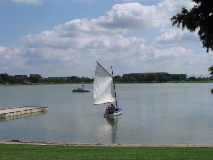 Sailboat leaving with first "crew" -- including Dave Woods and Tony Groner