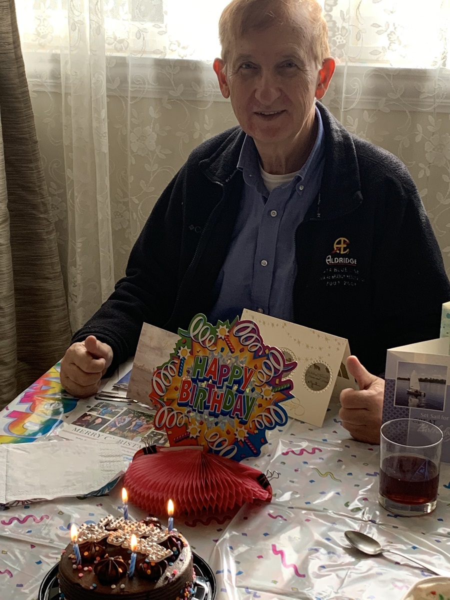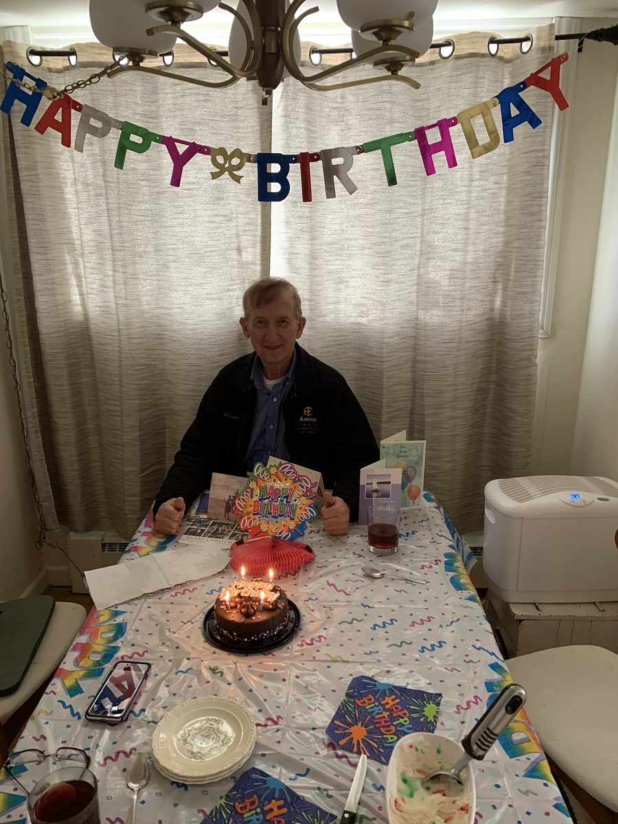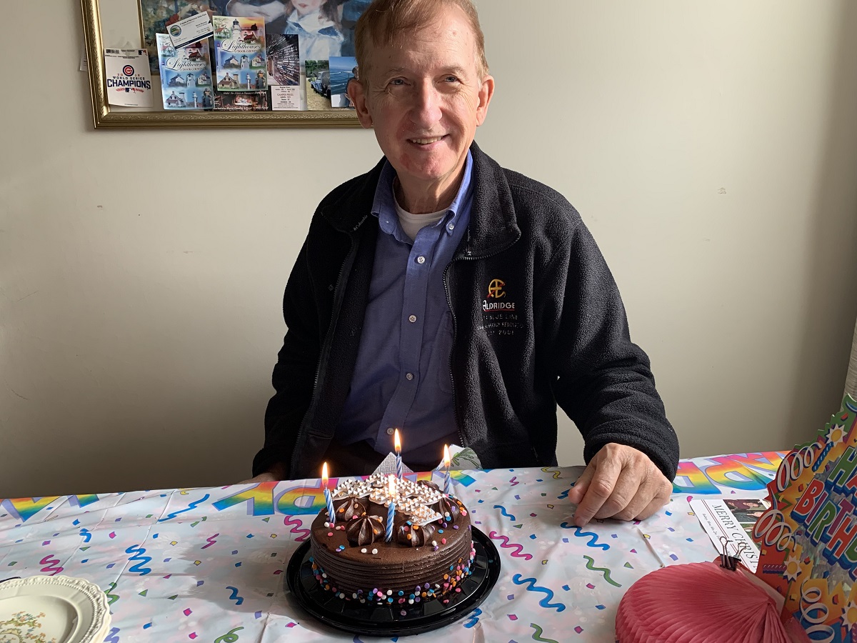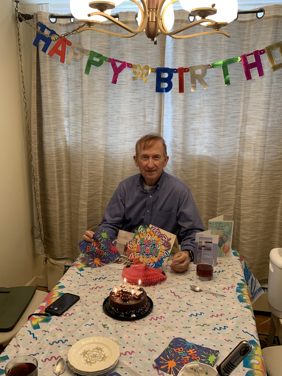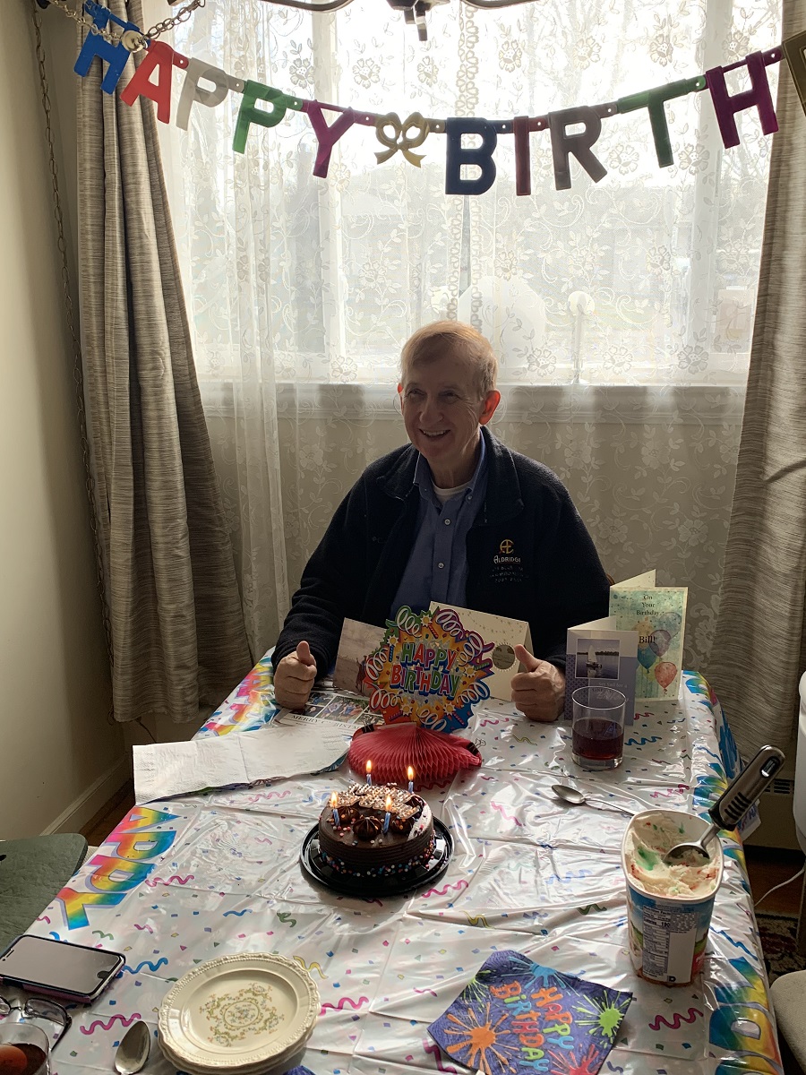 Bill with cards and BOTH "Happy Birthday" signs -- above and below