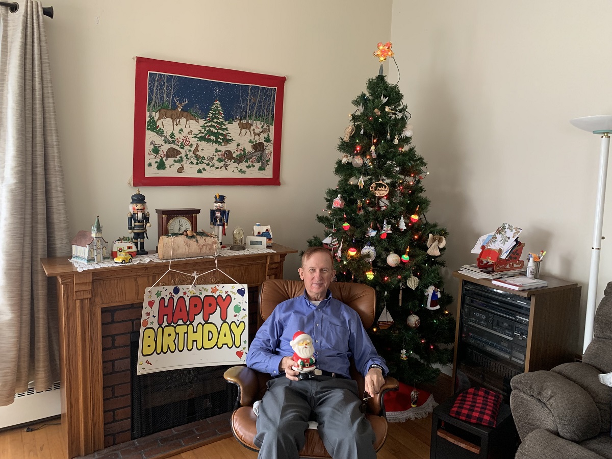 Bill by Christmas Tree, "Happy Birthday" sign and santa