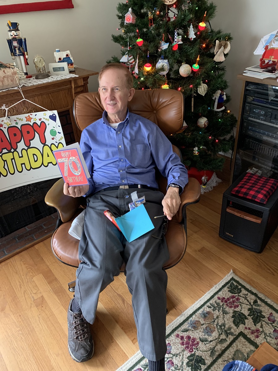 Bill by Christmas Tree, "Happy Birthday" sign, cards and santa