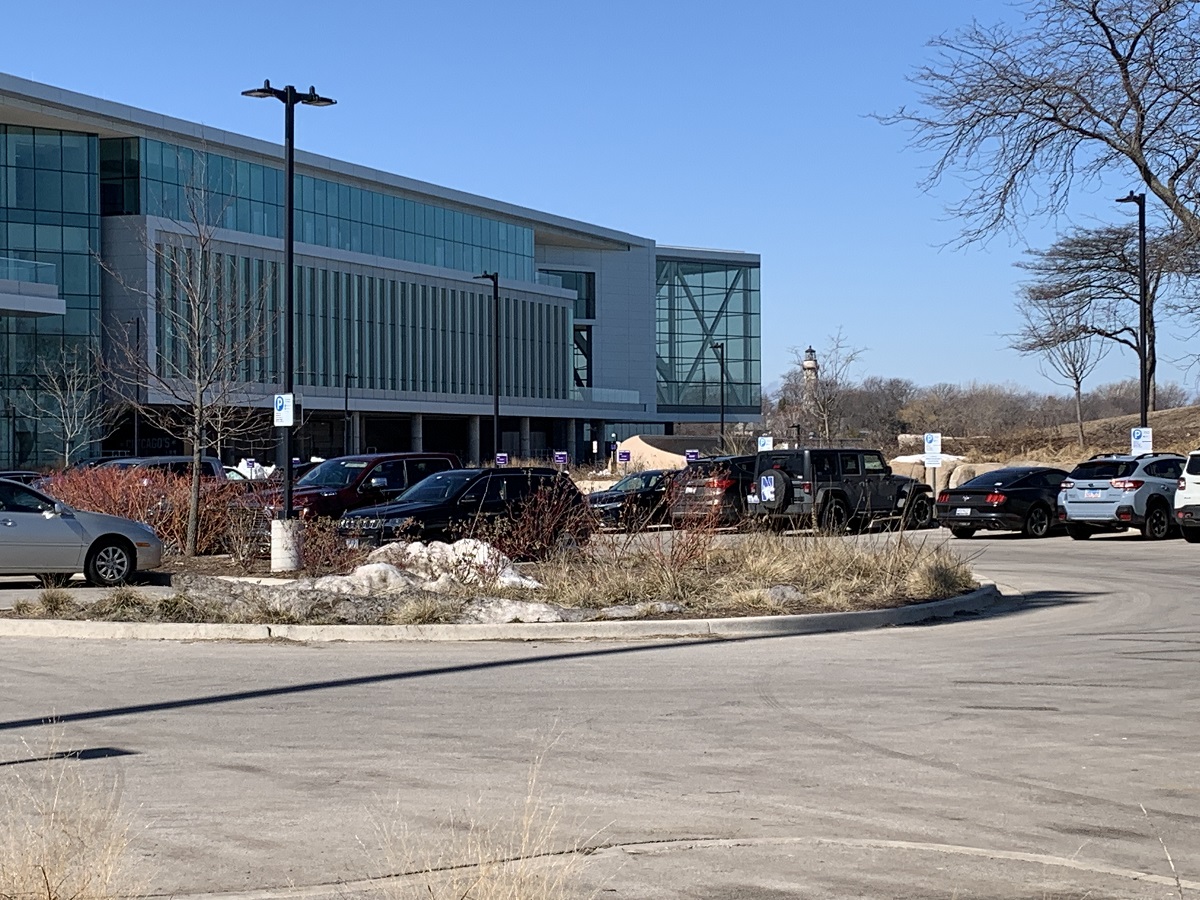 Looking NW at new NU sports pavilion and at Gross Point Lighthouse