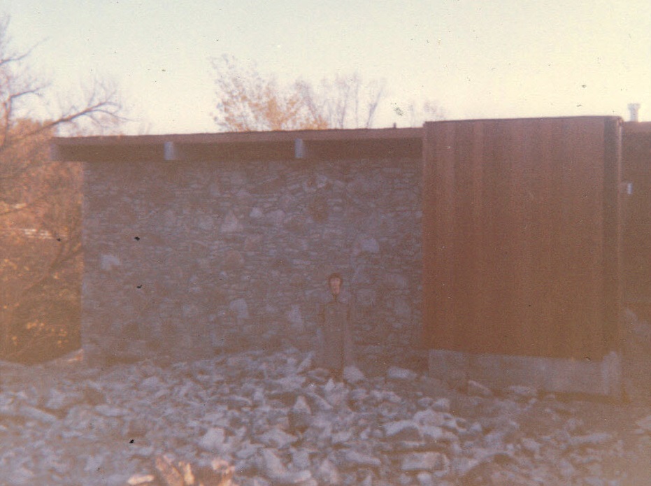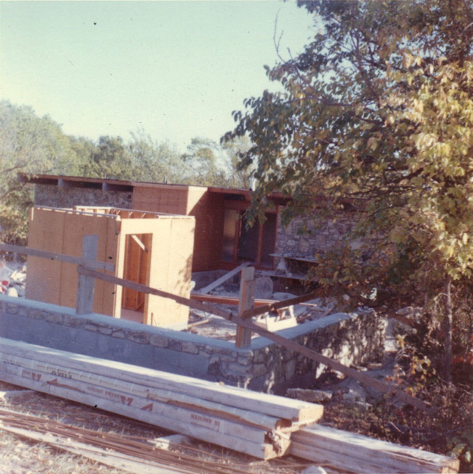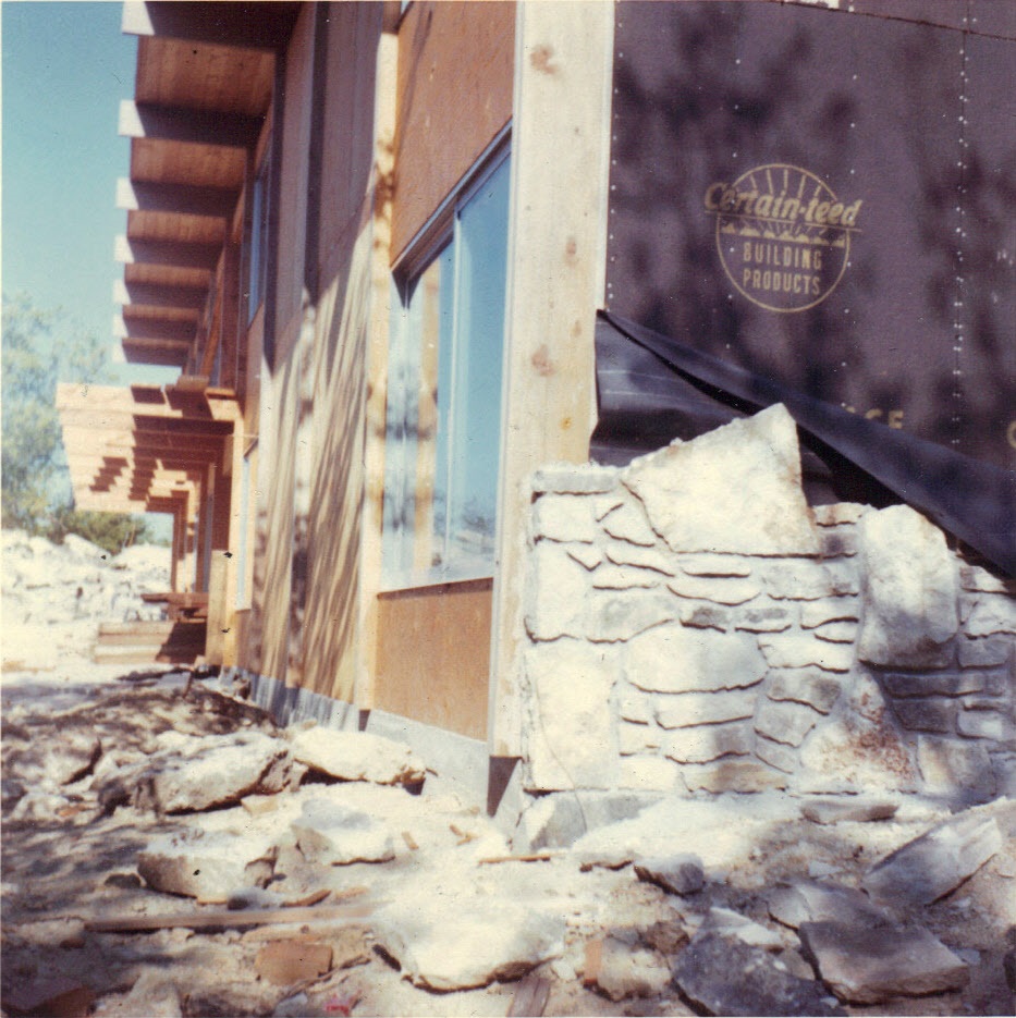 New house construction -- first view of beautiful original stonework around carport and on north side -- summer, 1963