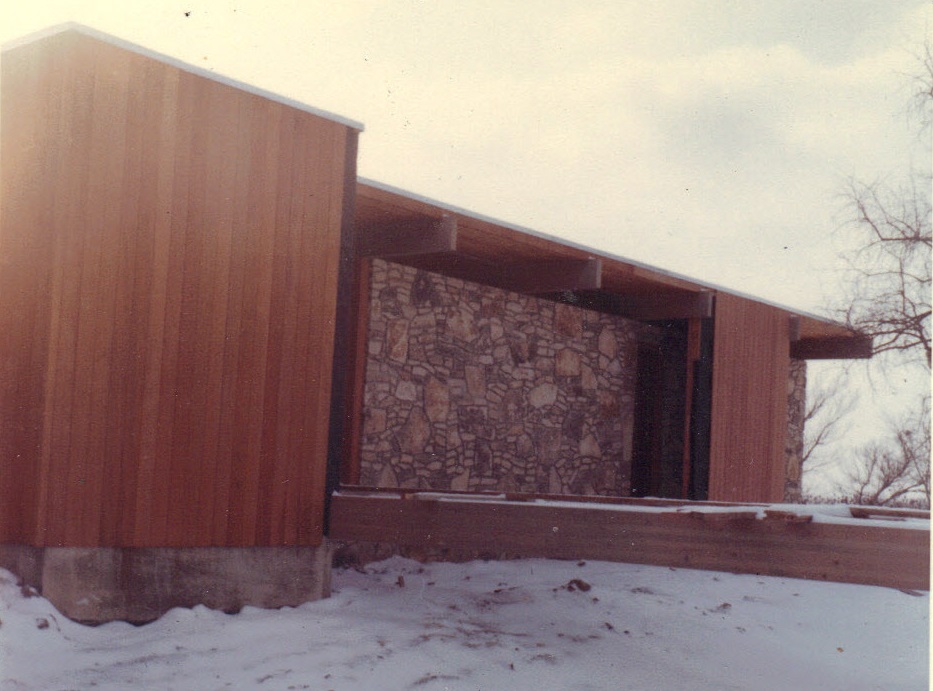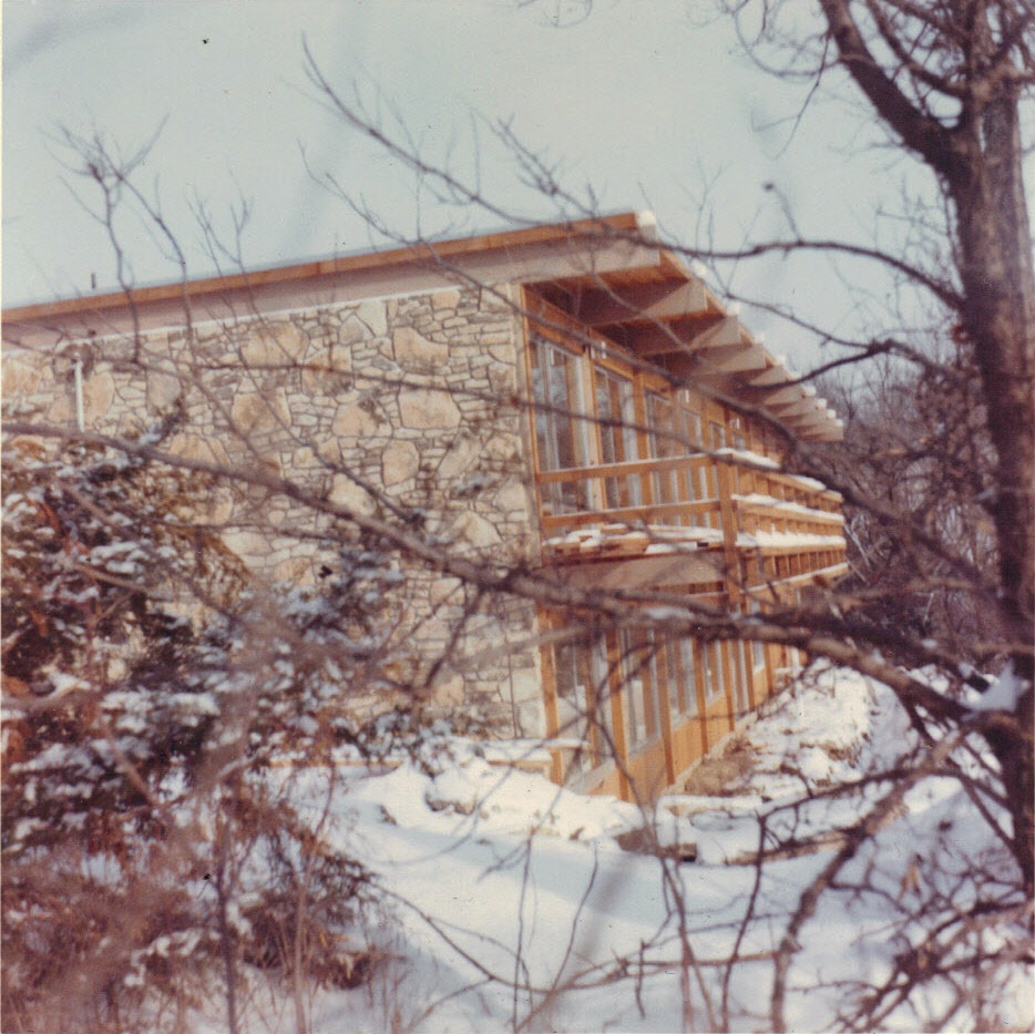 New house virtually complete showing stonework on west side and all of south side with glass doors and windows -- winter, 1963