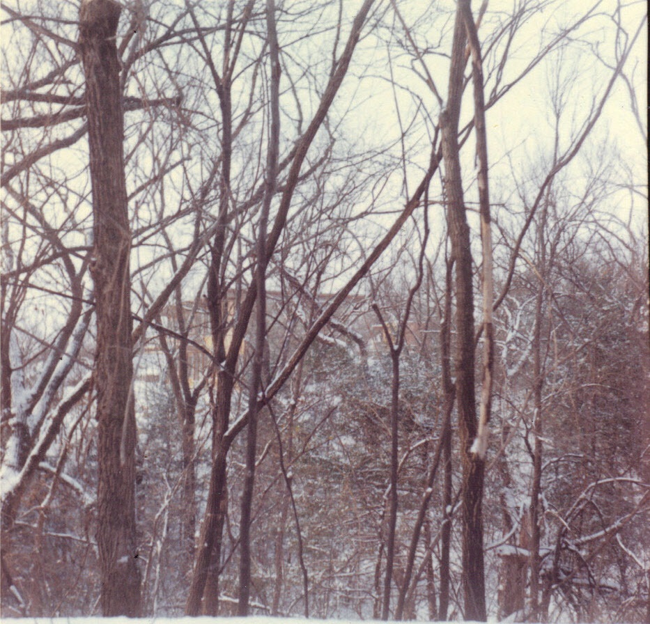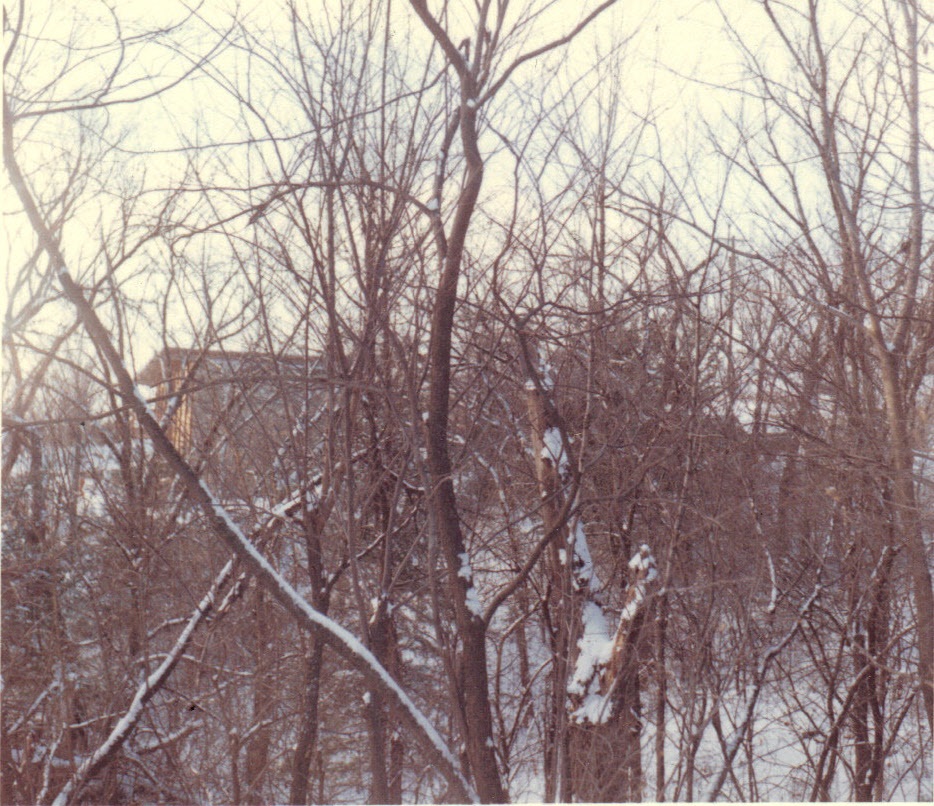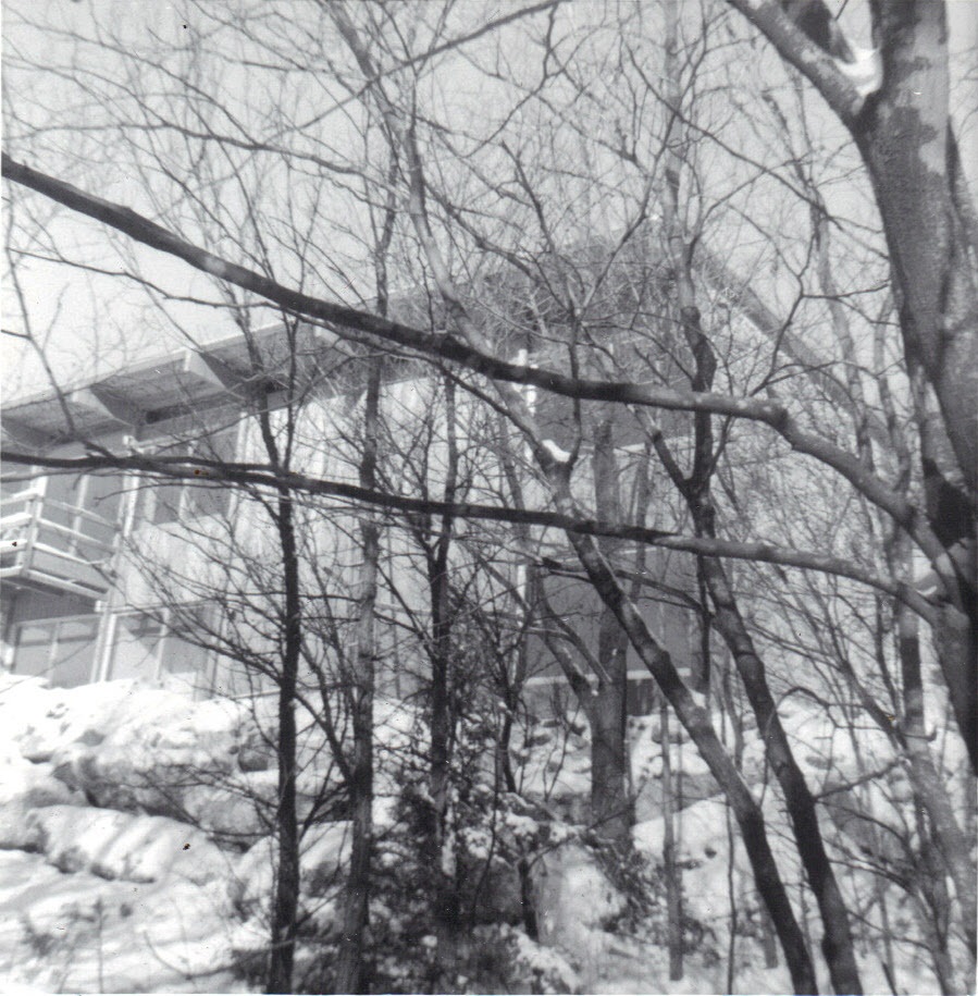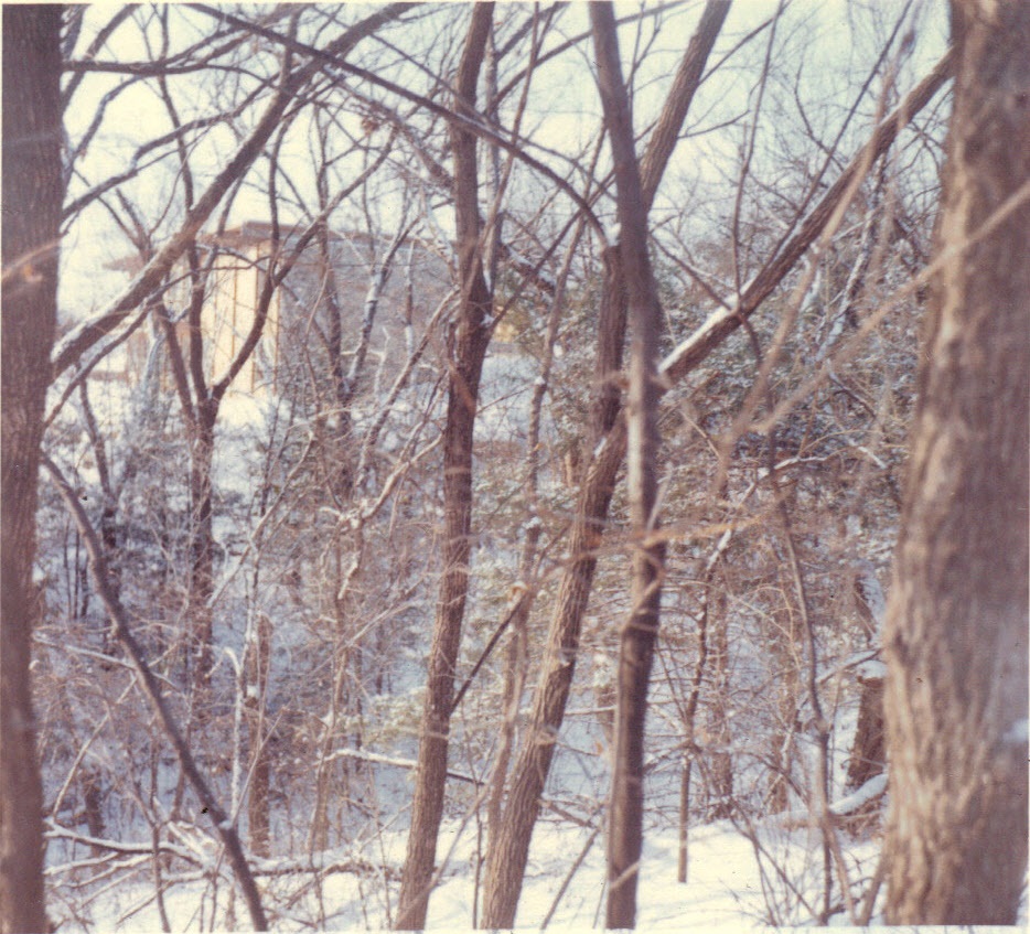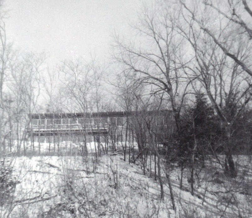 New house virtually complete through trees in ravine -- winter, 1963