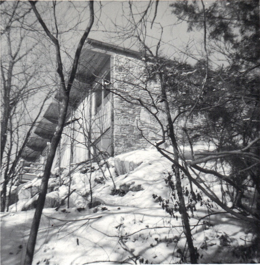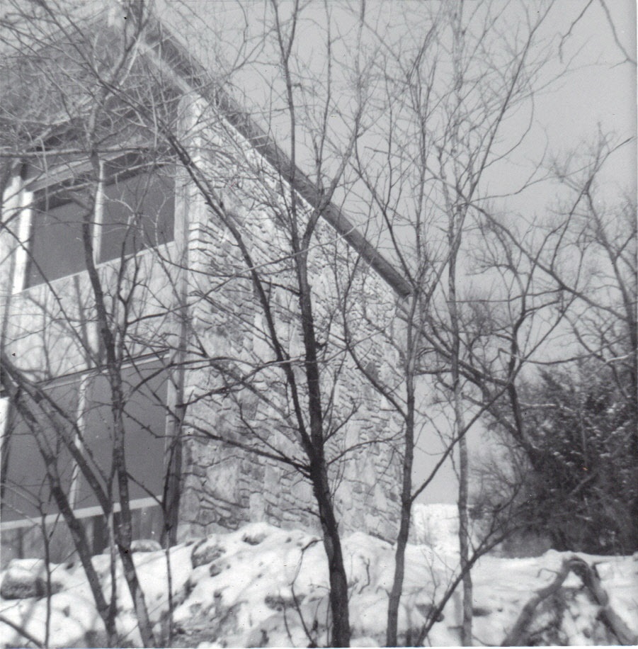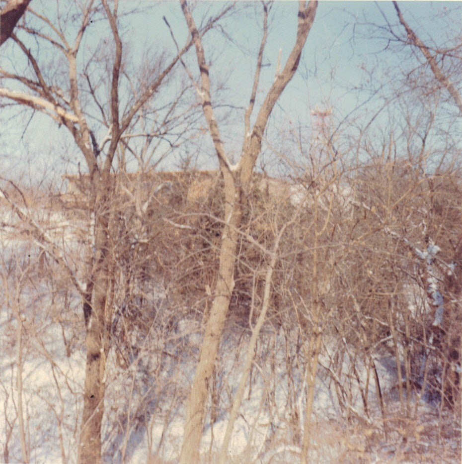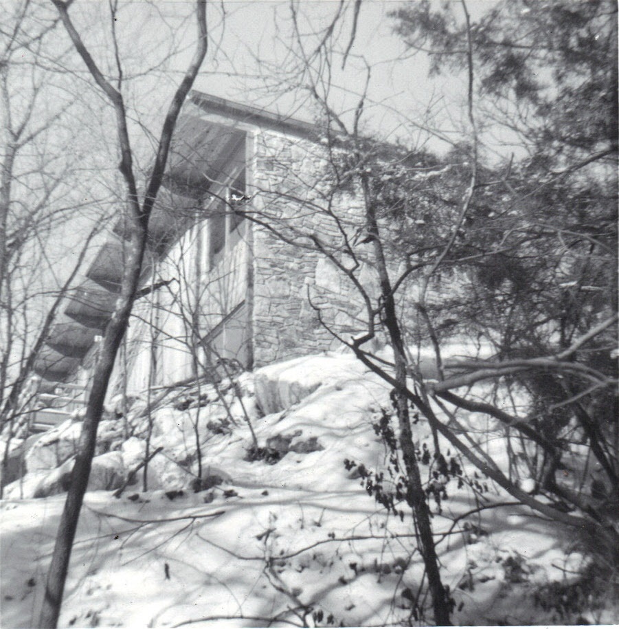 New house virtually complete through trees in ravine -- winter, 1963