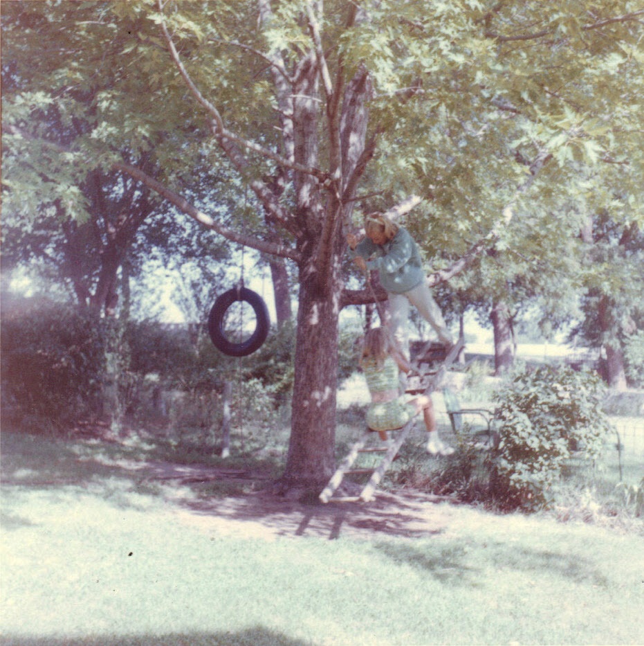 Dorothy and Carol playing in maple tree -- summer, 1963
