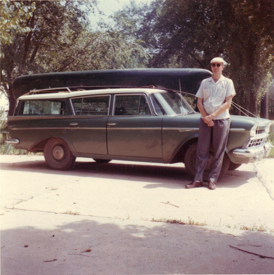 Dad with canoe on our green Rambler station wagon -- summer, 1963