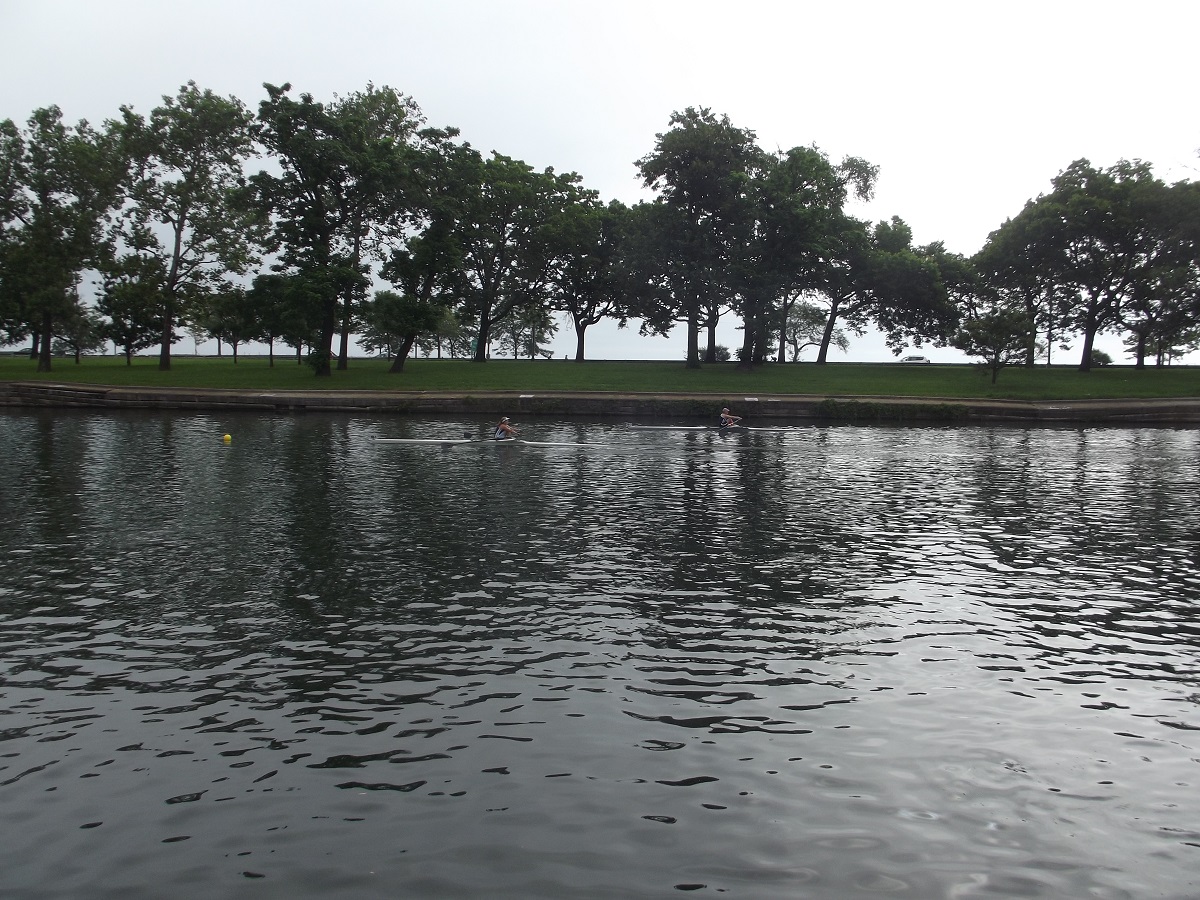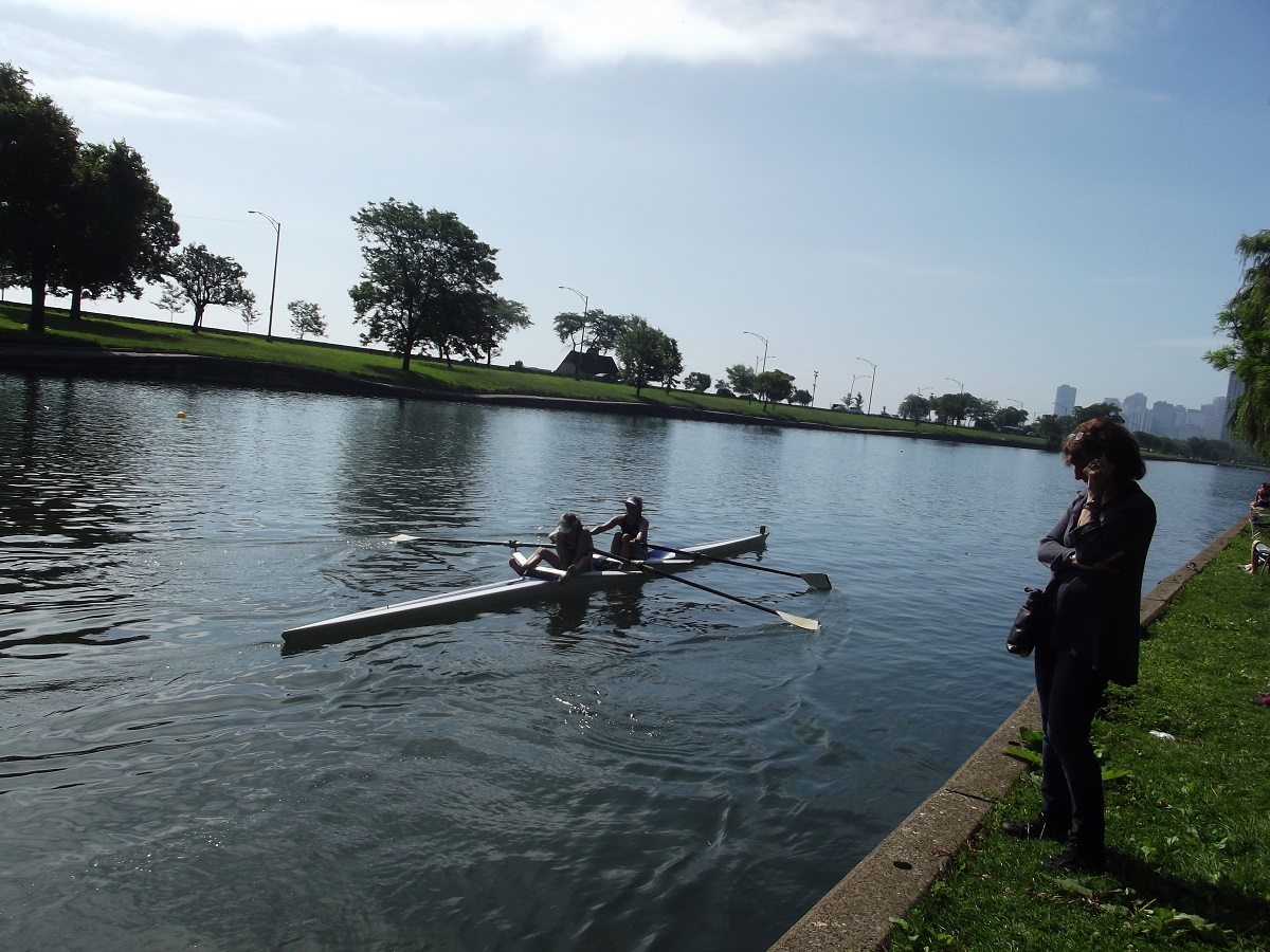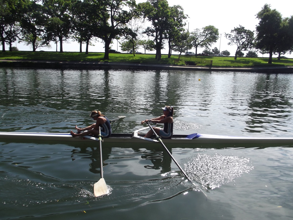 Carol, Dorothy sculling double to start looking south showing Lake Point Tower and a bit of the Hancock