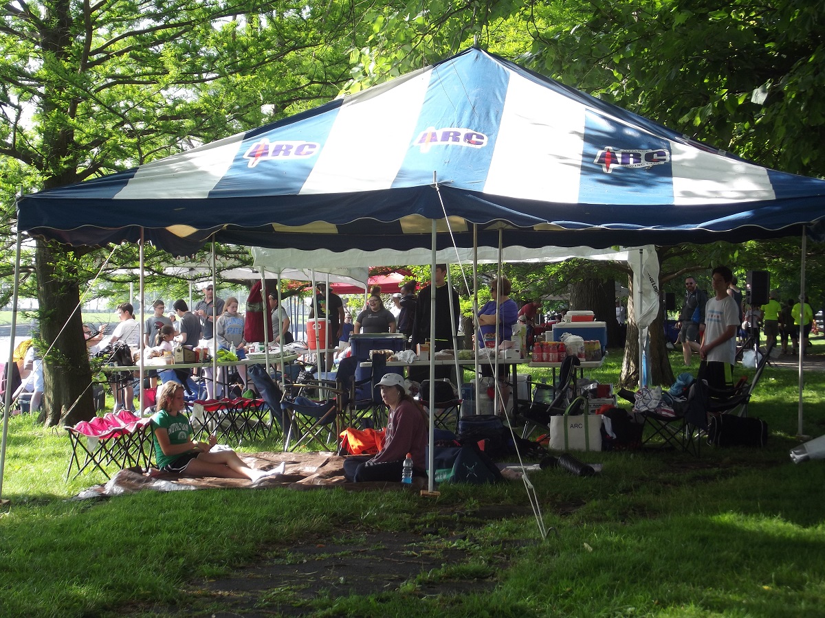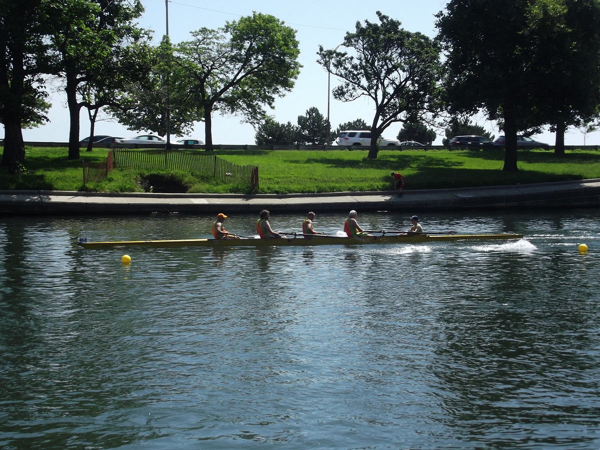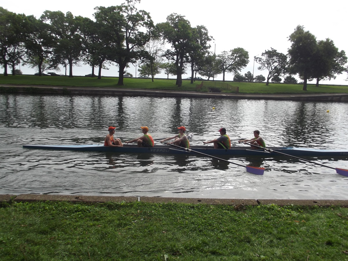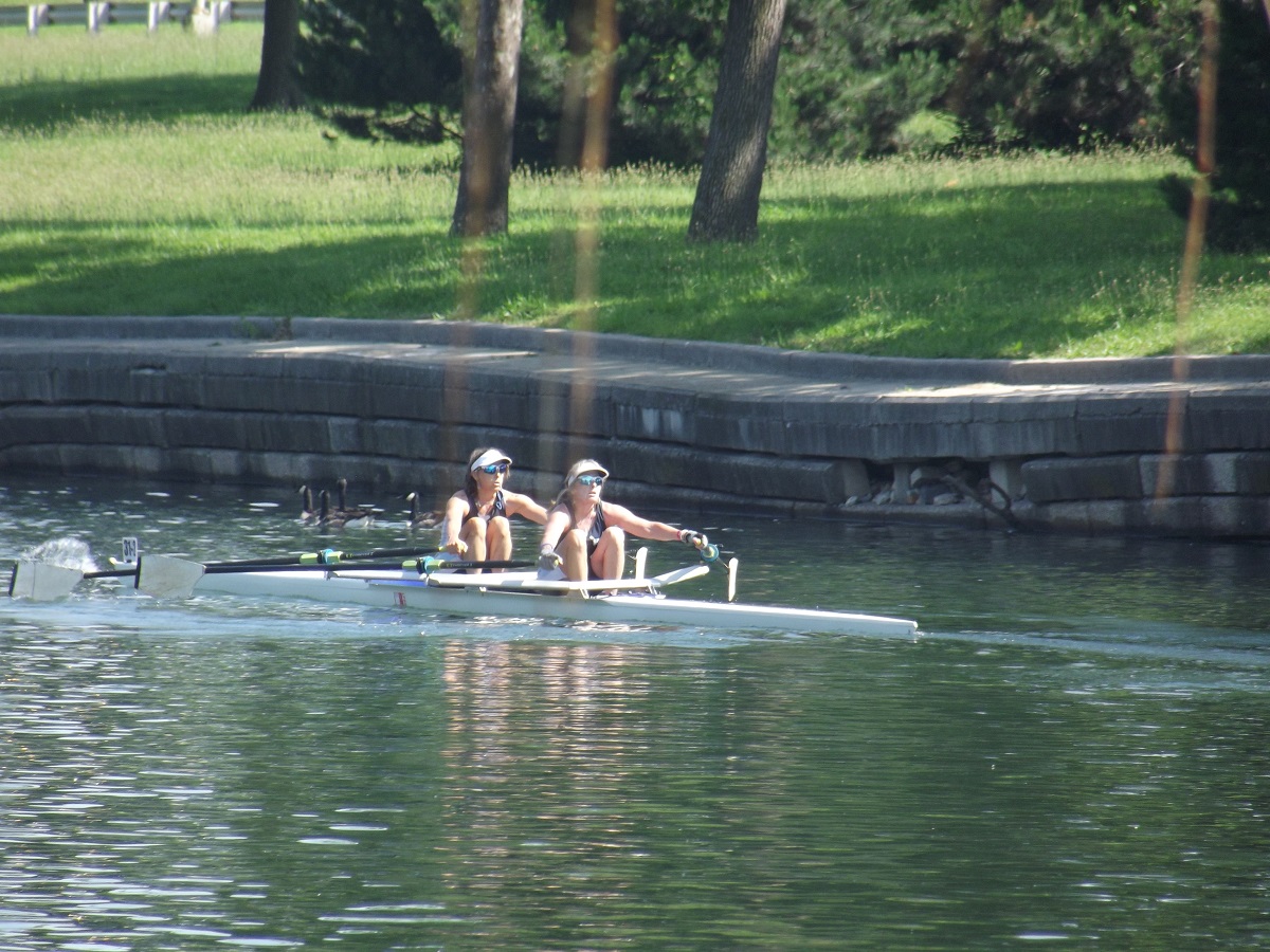 Carol, Dorothy sculling double to start looking south showing Lake Point Tower and a bit of the Hancock