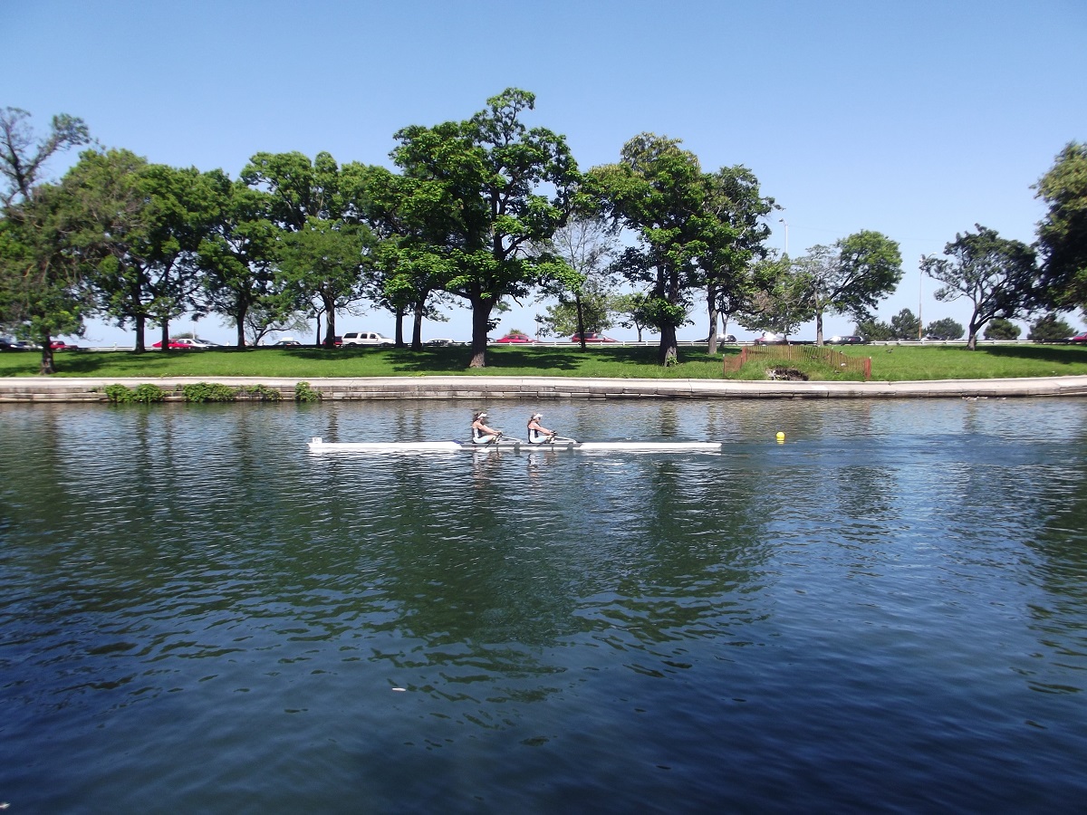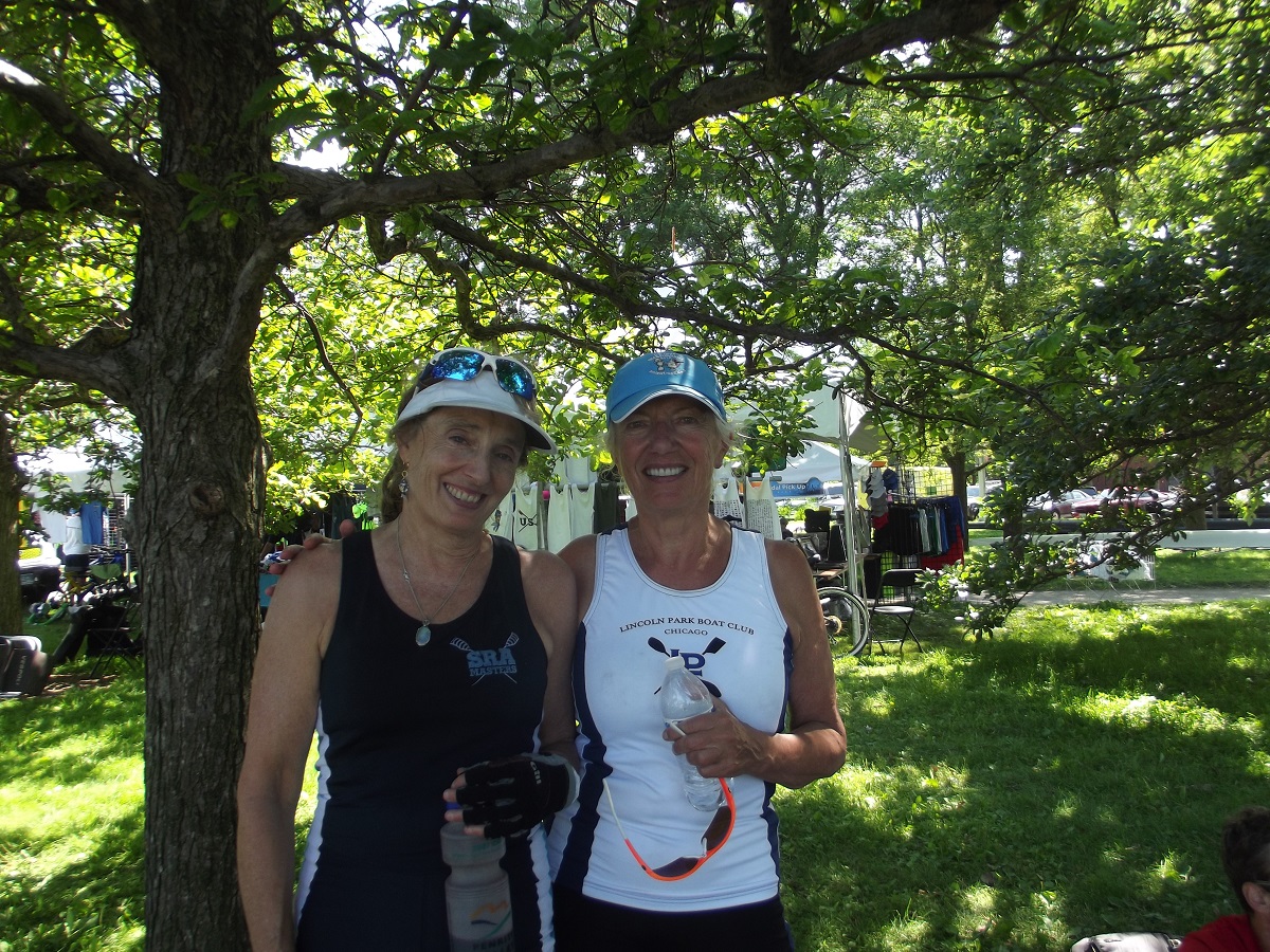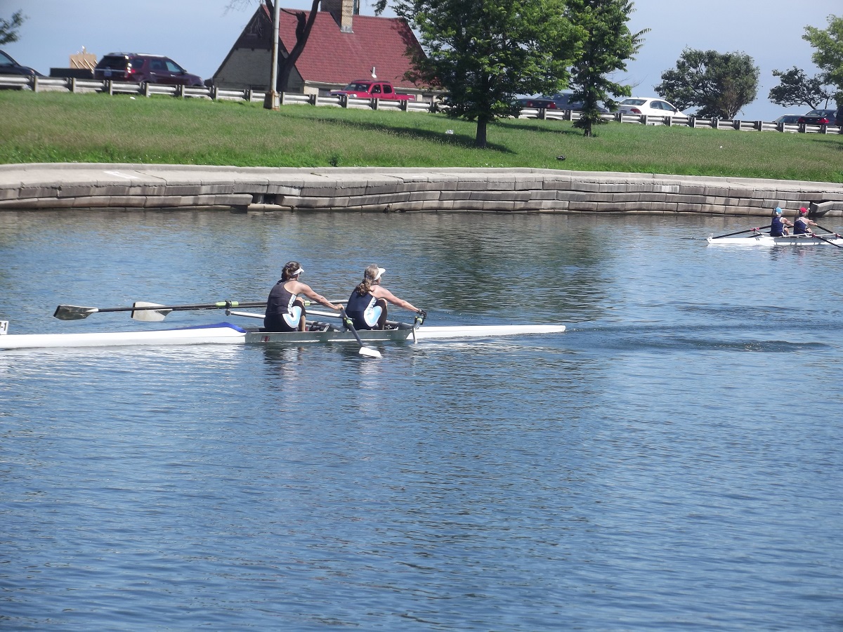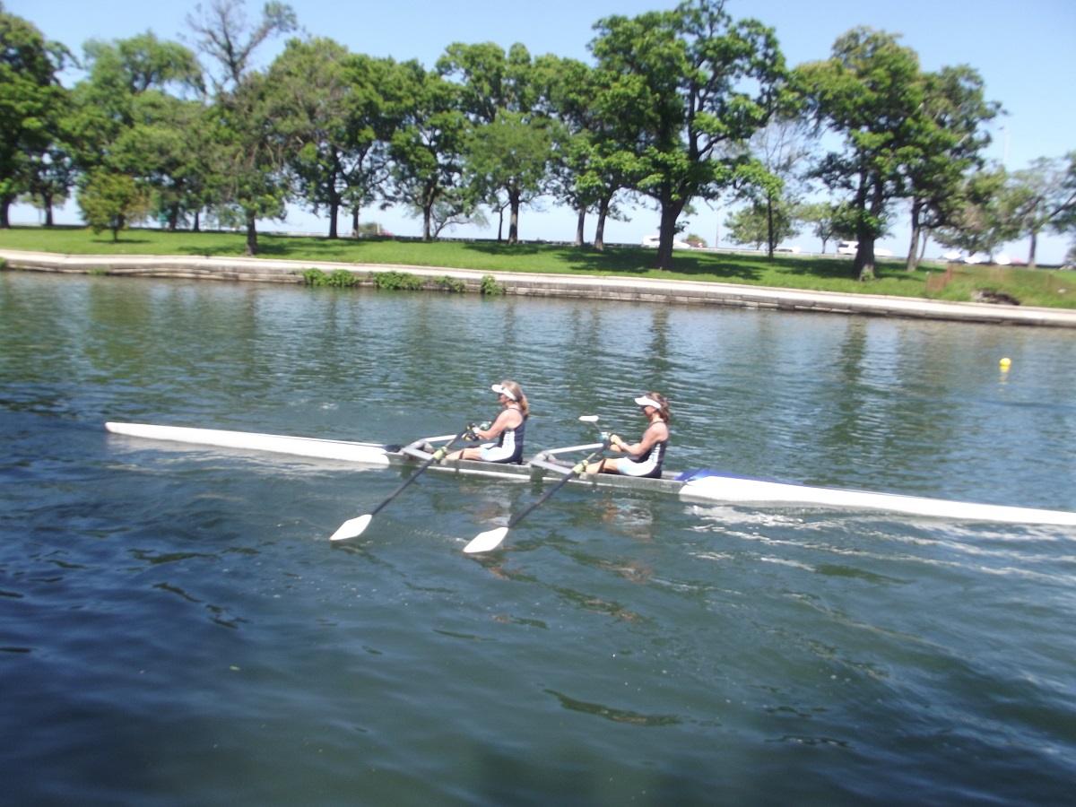 Dorothy and Carol sculling their double and clearly beating their competitors