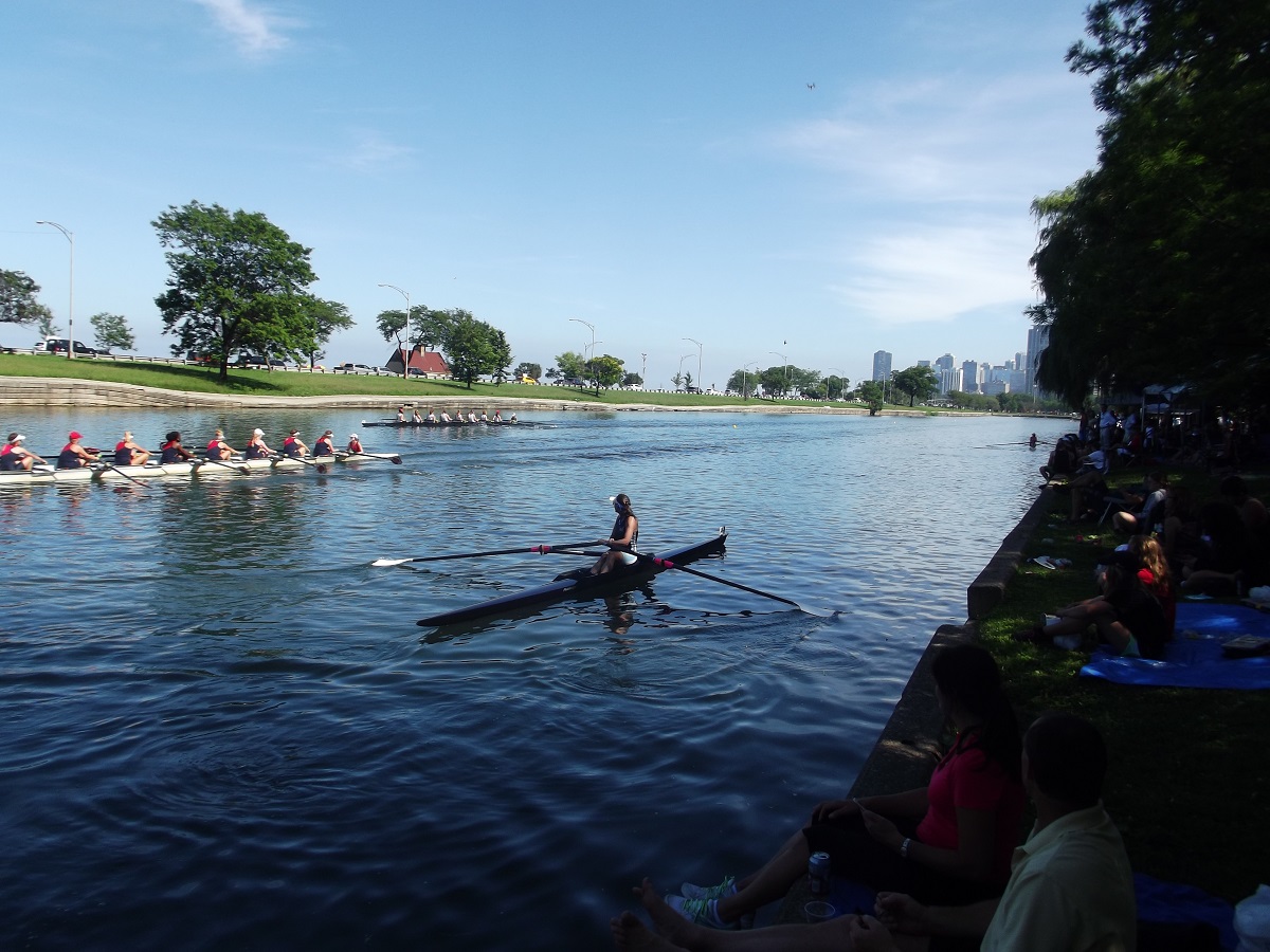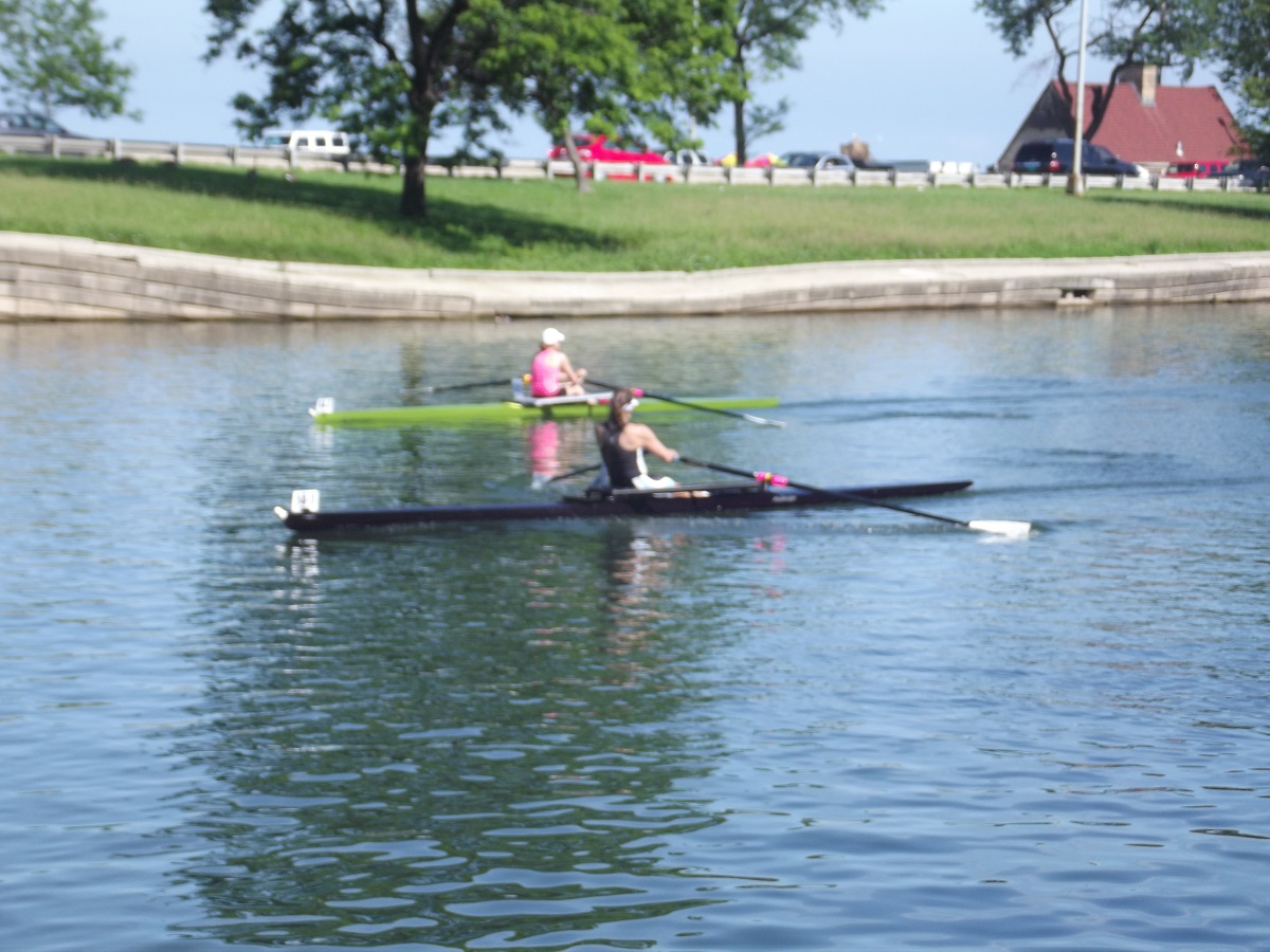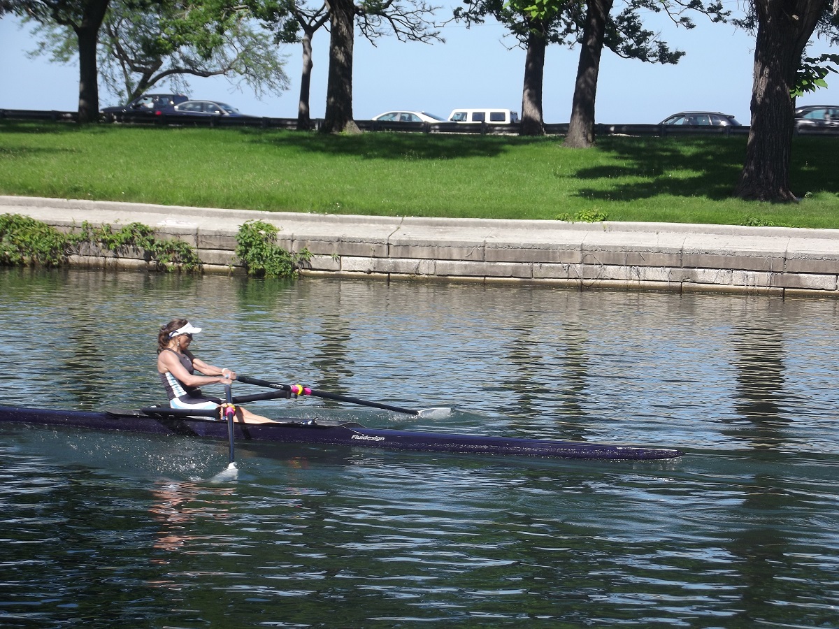 Dotothy carefully hugging the shore on her way to the start of the single final as a race between two sweeping eights sweeps past