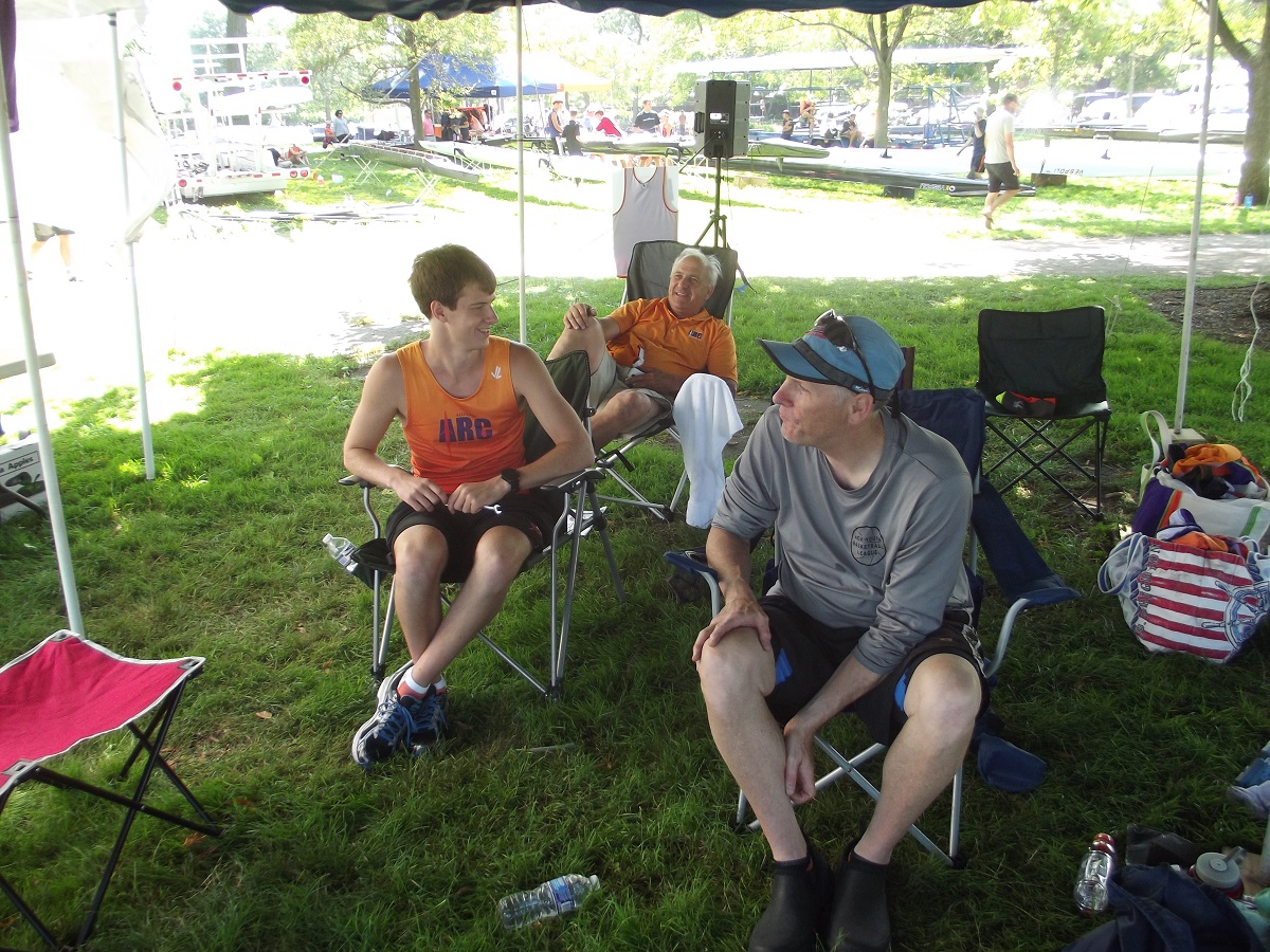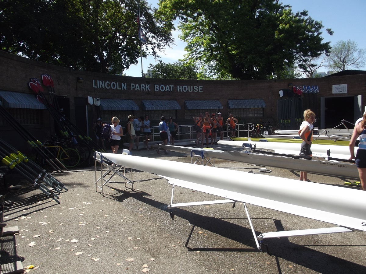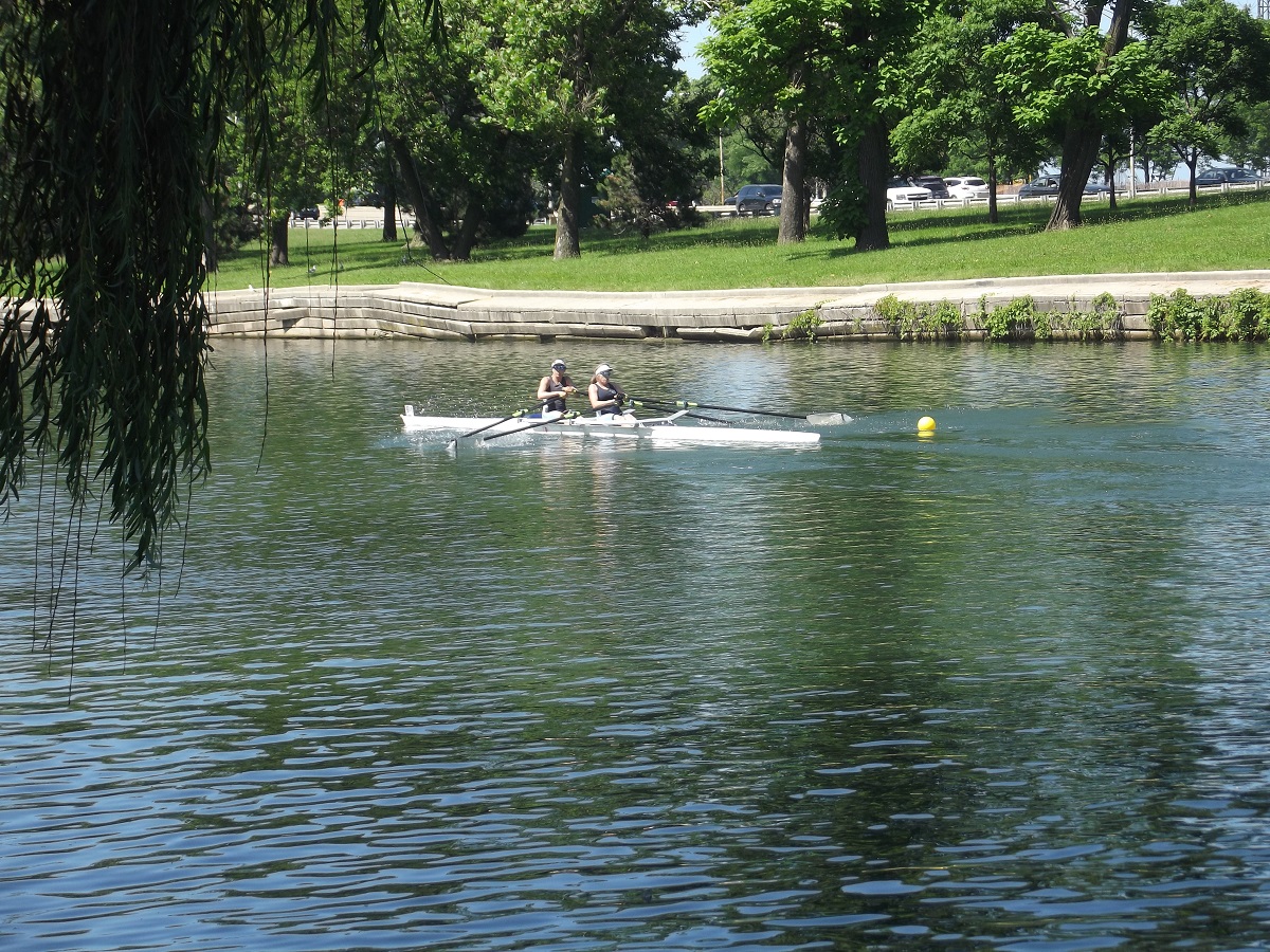 Dotothy carefully hugging the shore on her way to the start of the single final as a race between two sweeping eights sweeps past