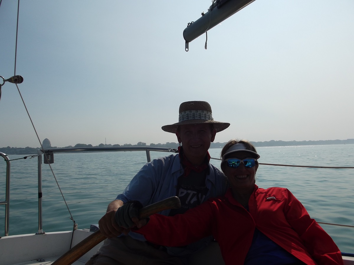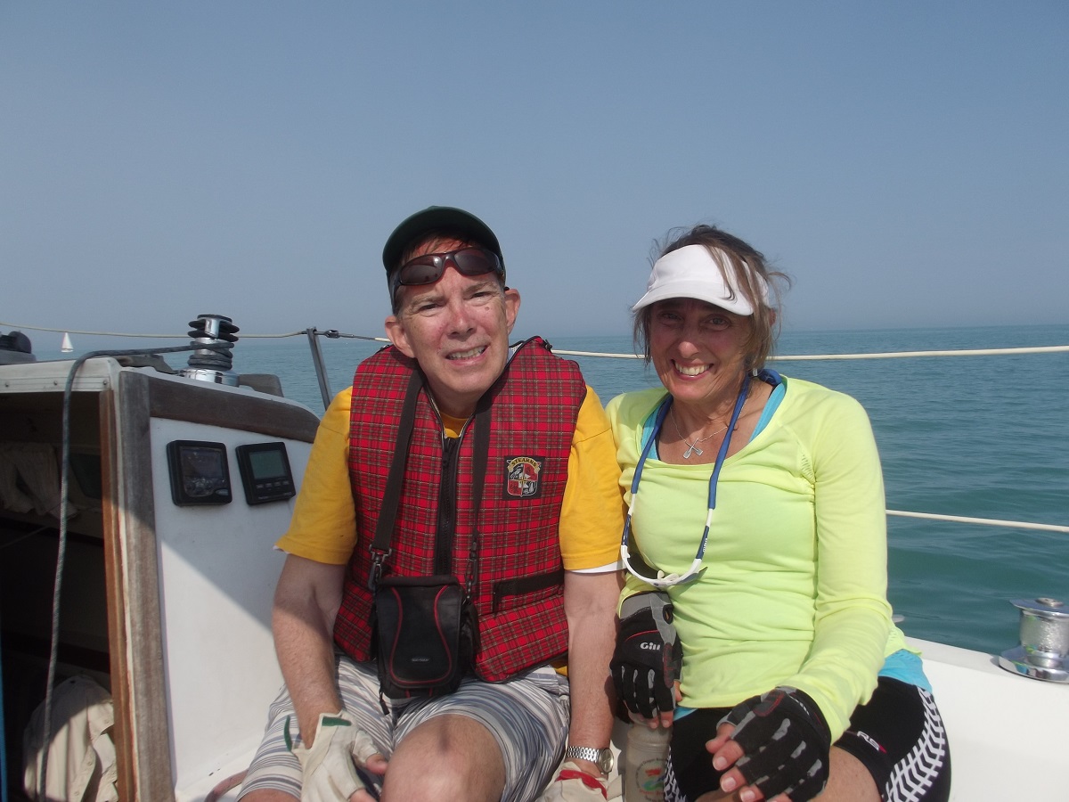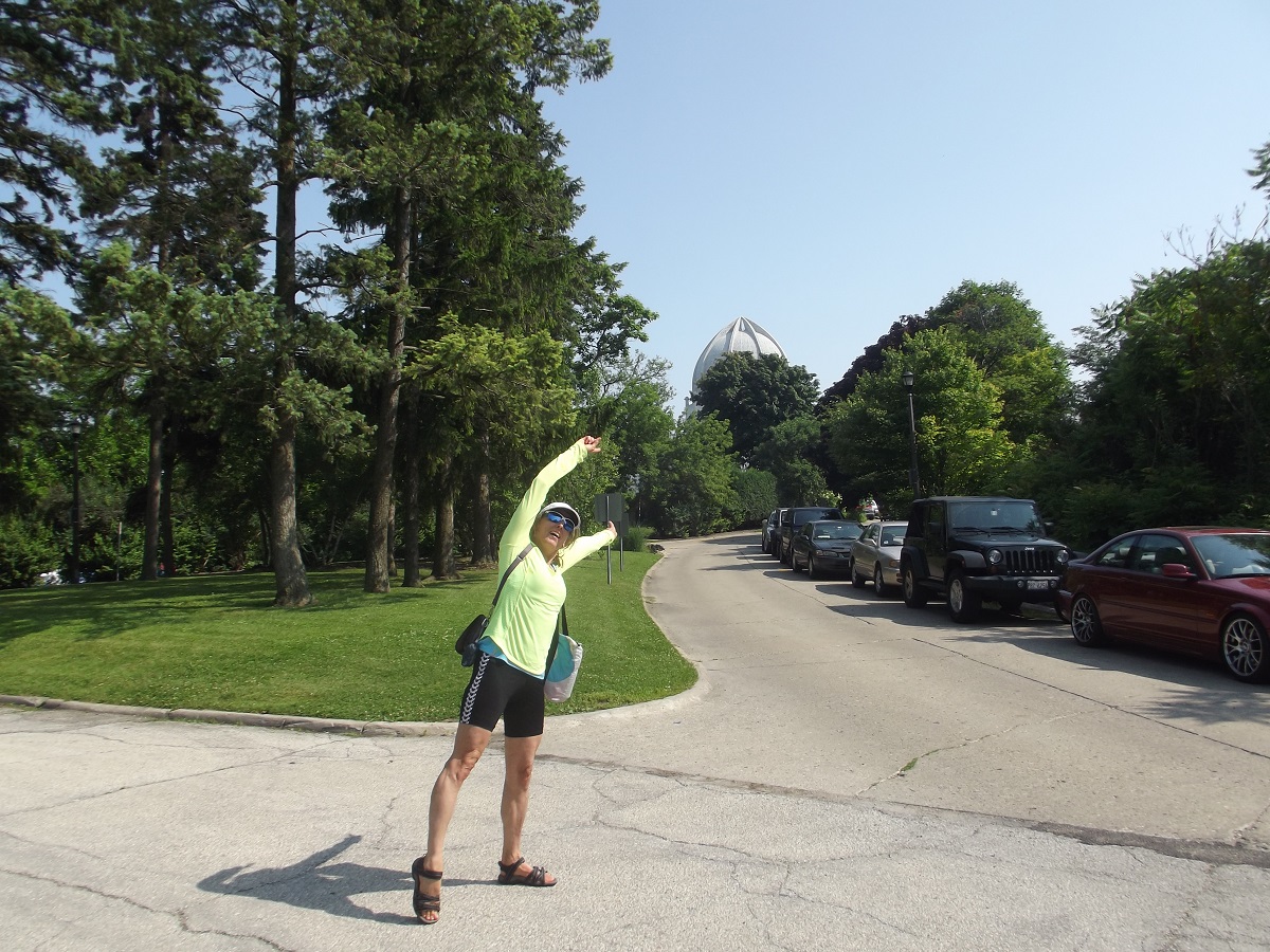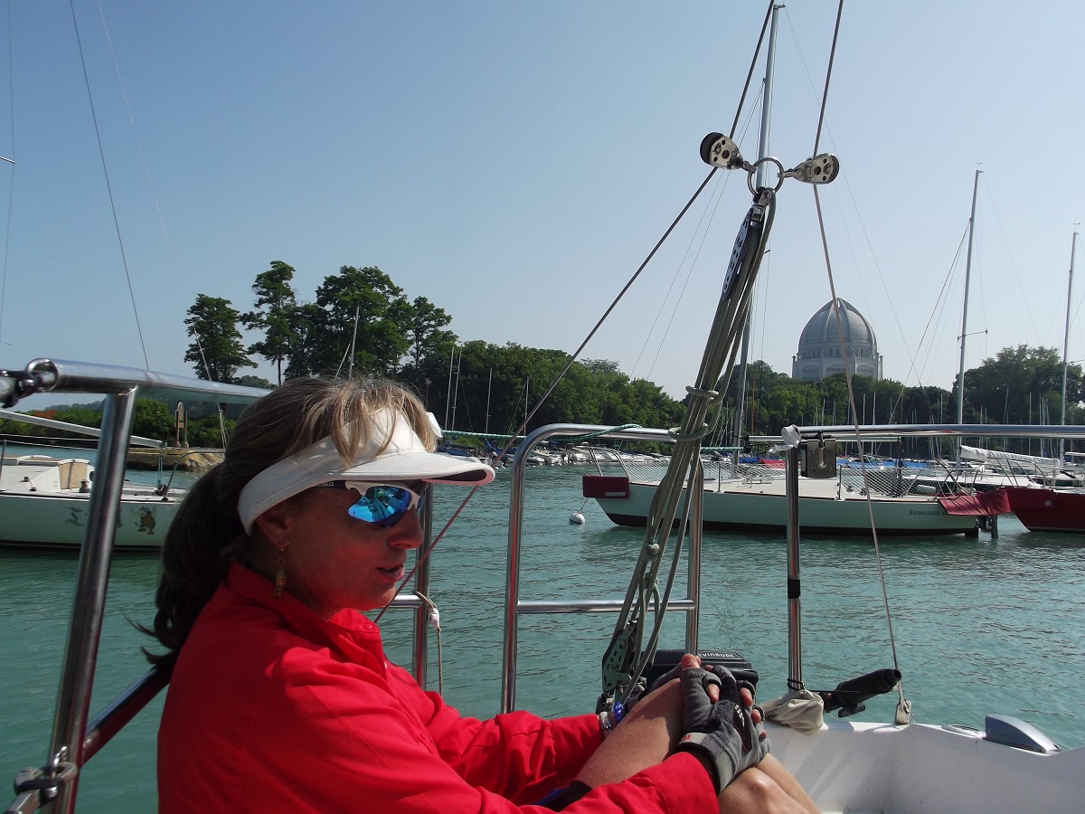 Carol with Baha'i Temple on Misty Winds while we were waiting for Captain Bill