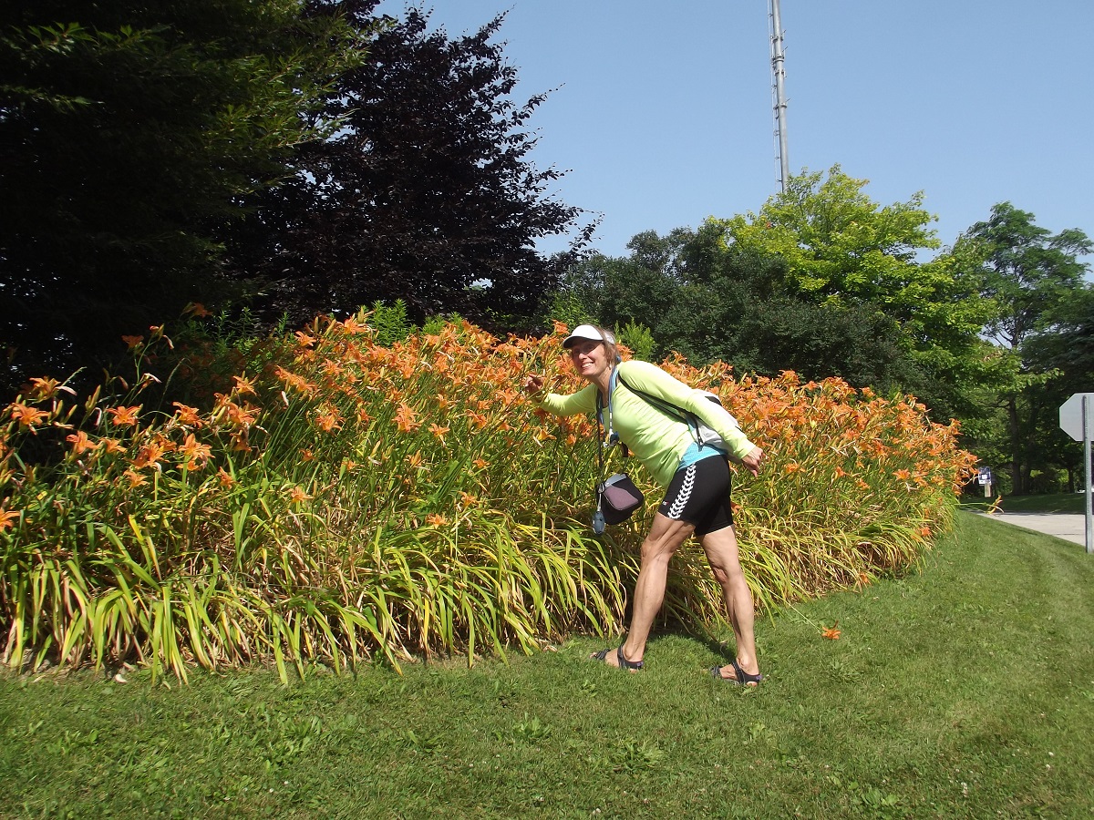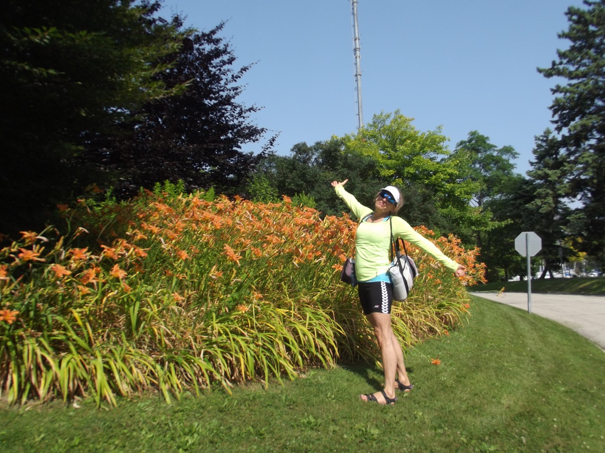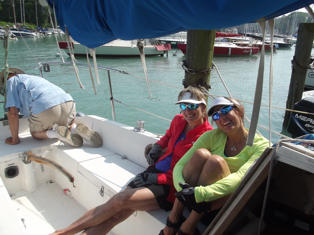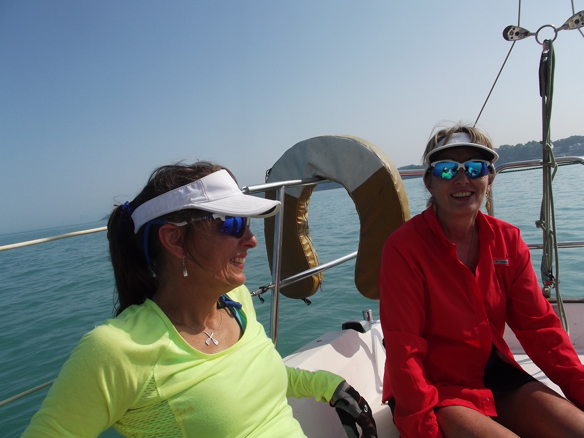 Carol with Baha'i Temple on Misty Winds while we were waiting for Captain Bill