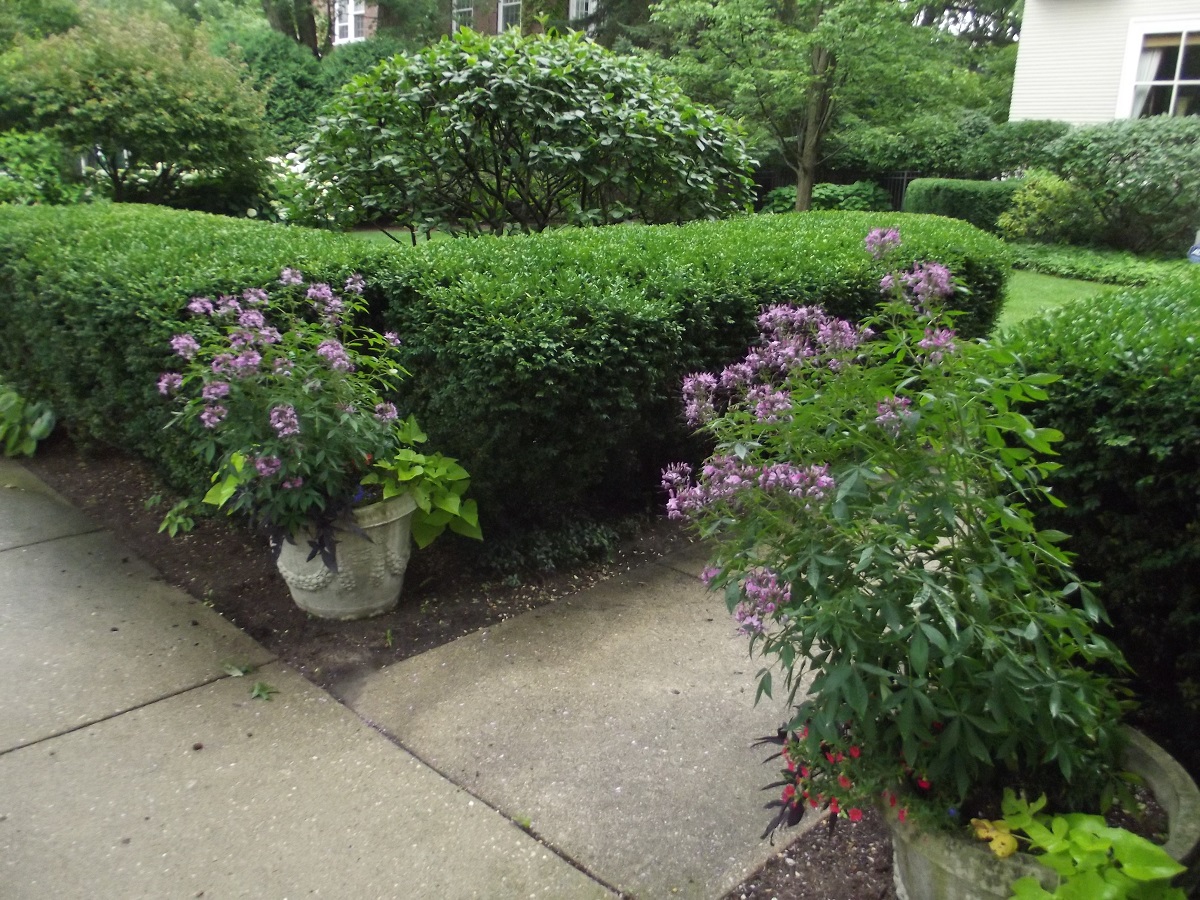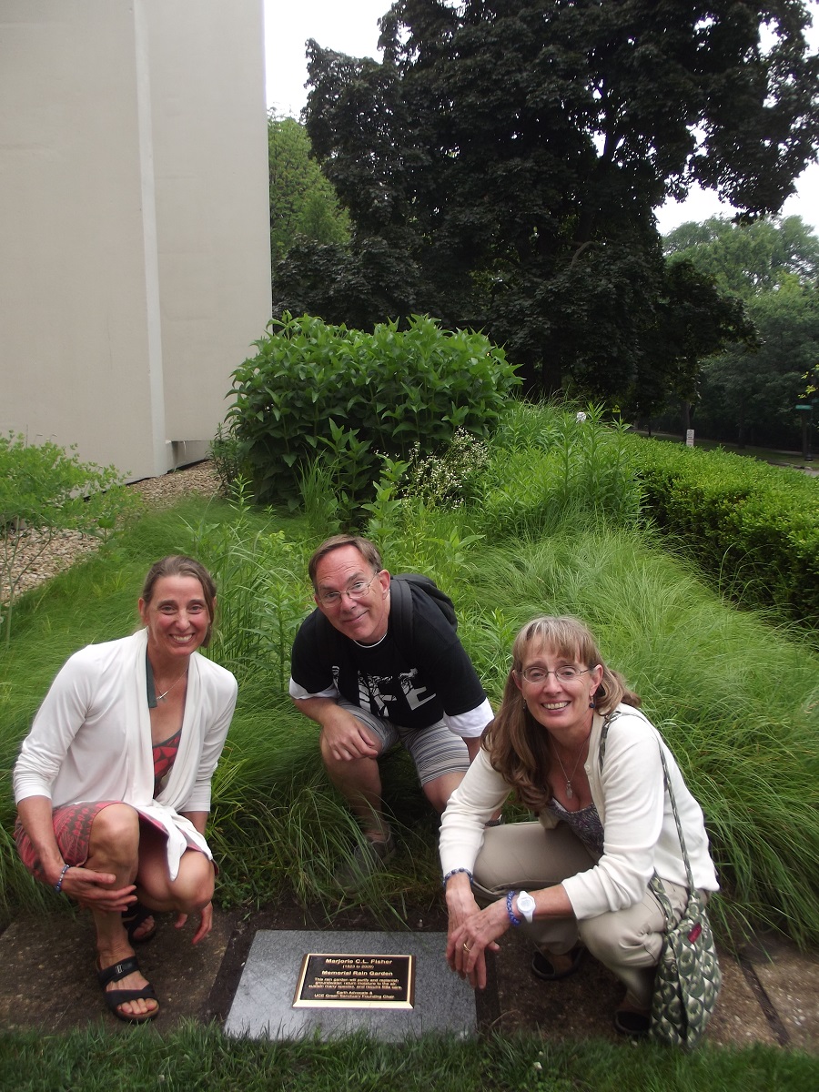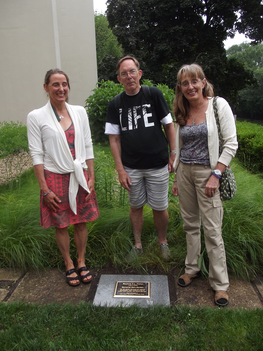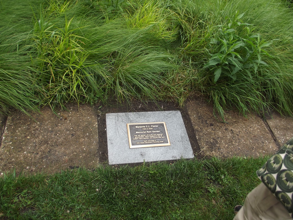 Marjorie's plaque and stone by her memorial rain garden at the Unitarian Church
