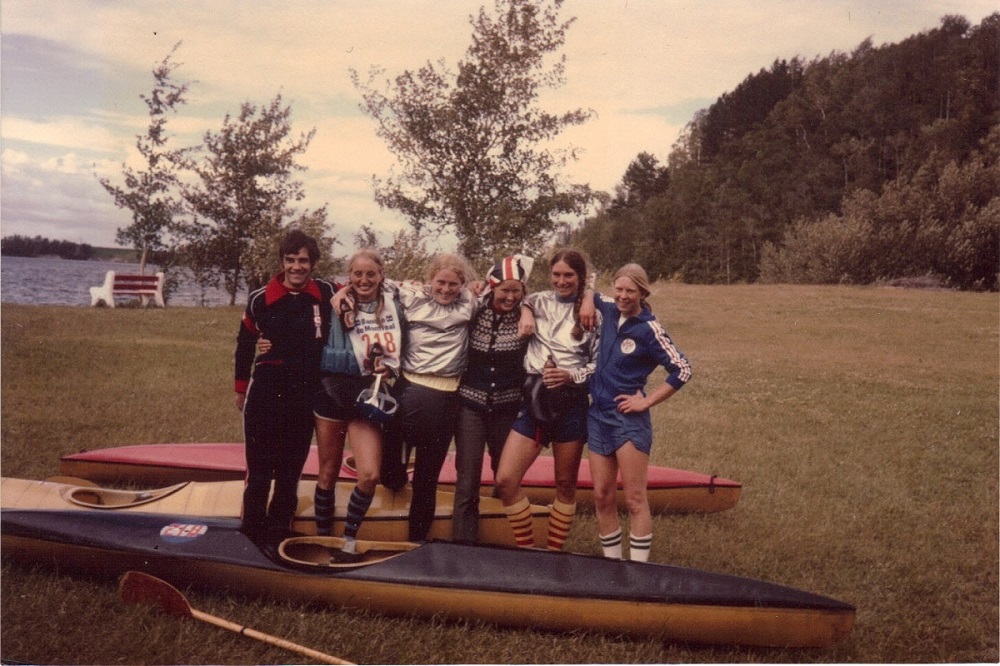 David Mitchell, Carol, Cathy Hearn, Peggy Mitchell, Leslie Klein, Laurie Walters -- just after USA team won 1979 team race, Desbiens, Quebec