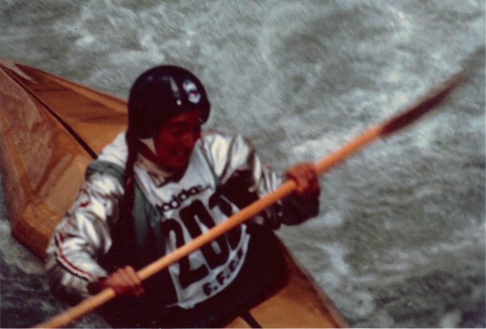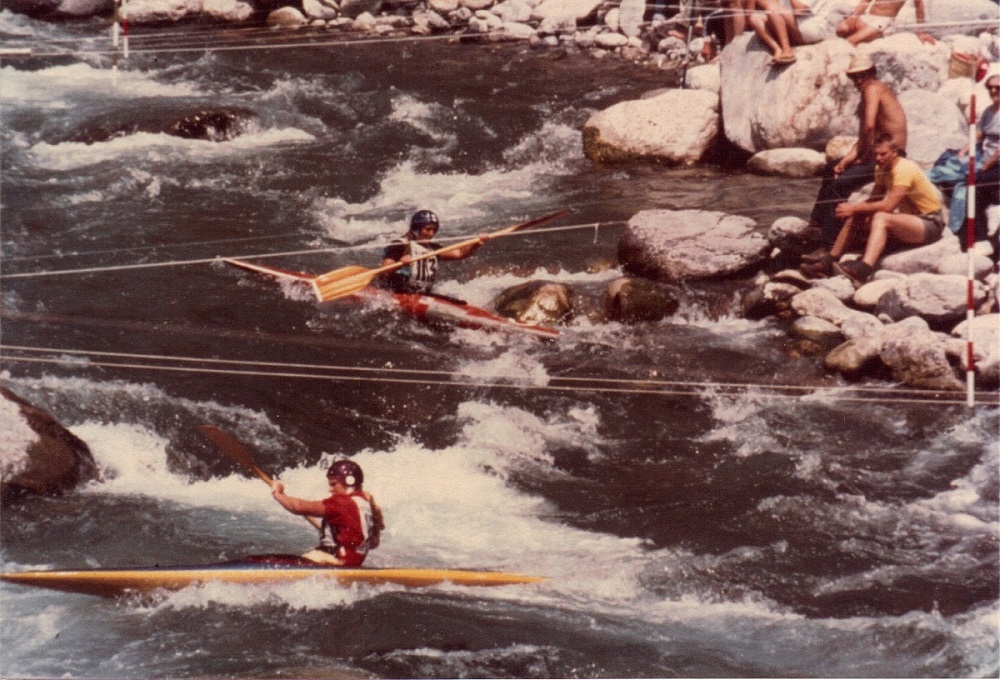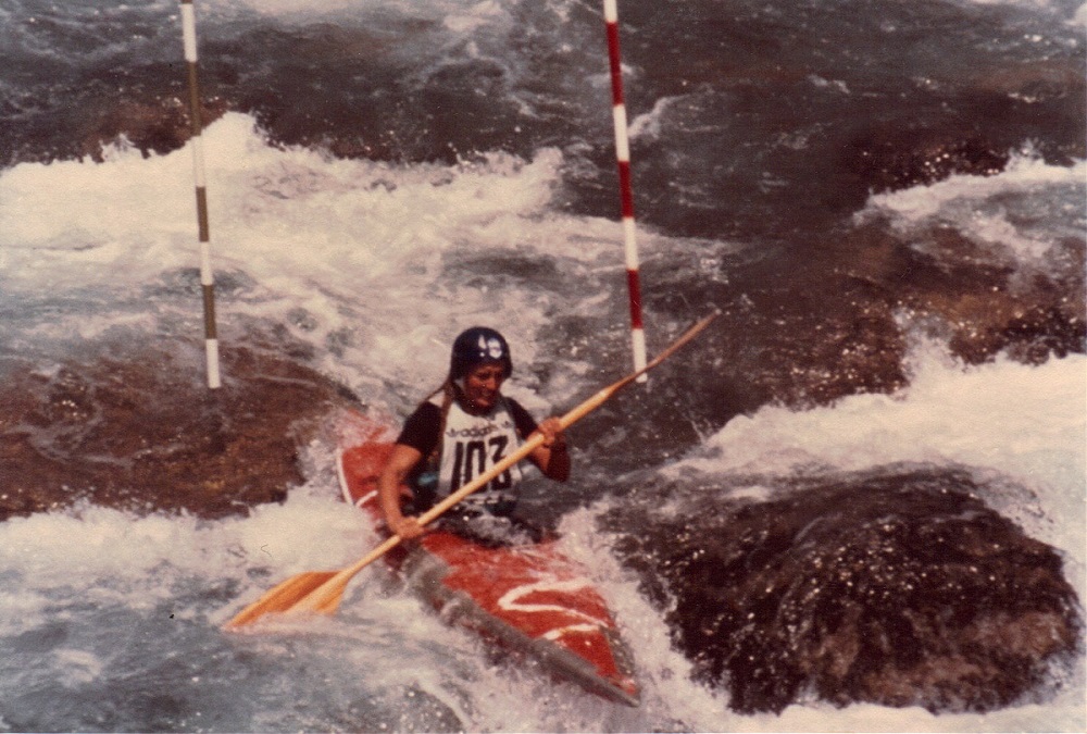Carol whitewater kayak racing in France on Bruil sur Roya -- 1980
