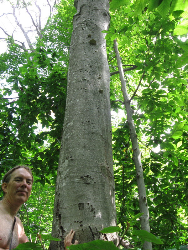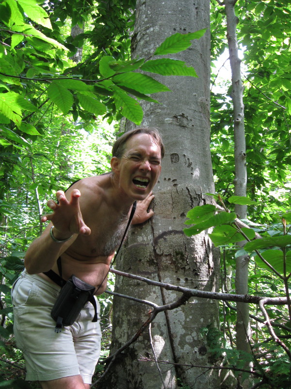 Andy impersonating a bear with tree showing bear's claw marks