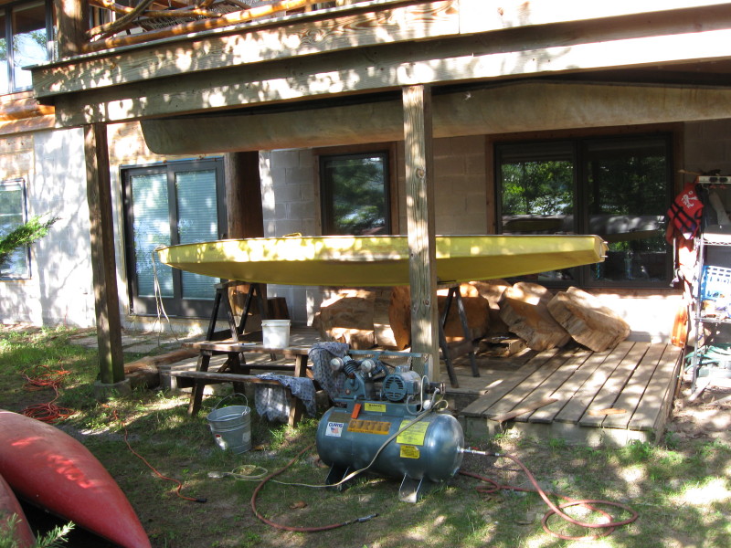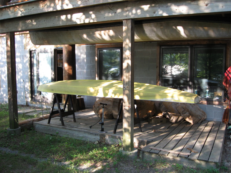 After much effort draining all the water out of the hull, Carol, Jim, Nick and Andy placed it on these sawhorses -- 9/5/09