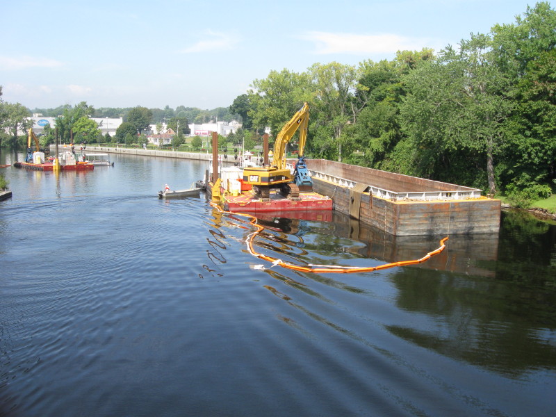 Barges and EPA dredging equipment in branch of Hudson River