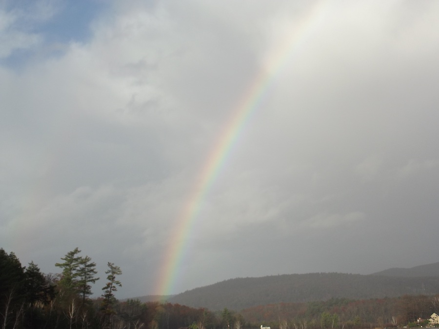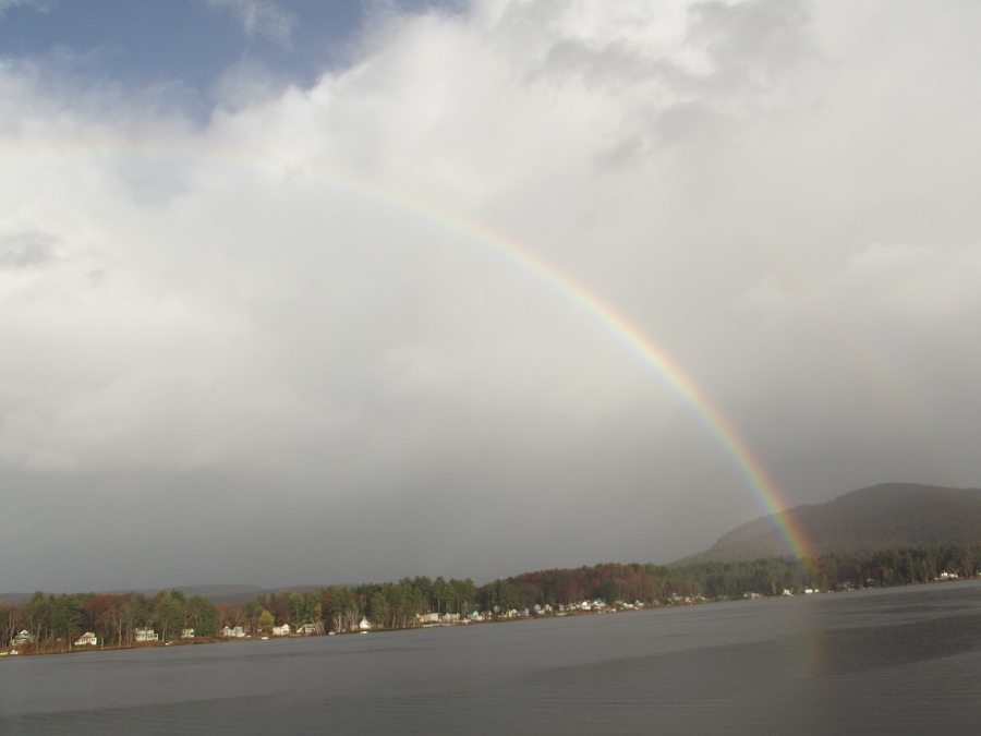 Notice the second rainbow above the first for two refractive bounces within each drop instead of one