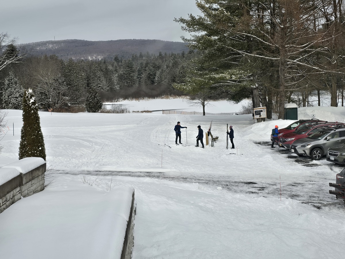 Many XC skiers on groomeed golf course with trails into woods where we XC skied the last two days