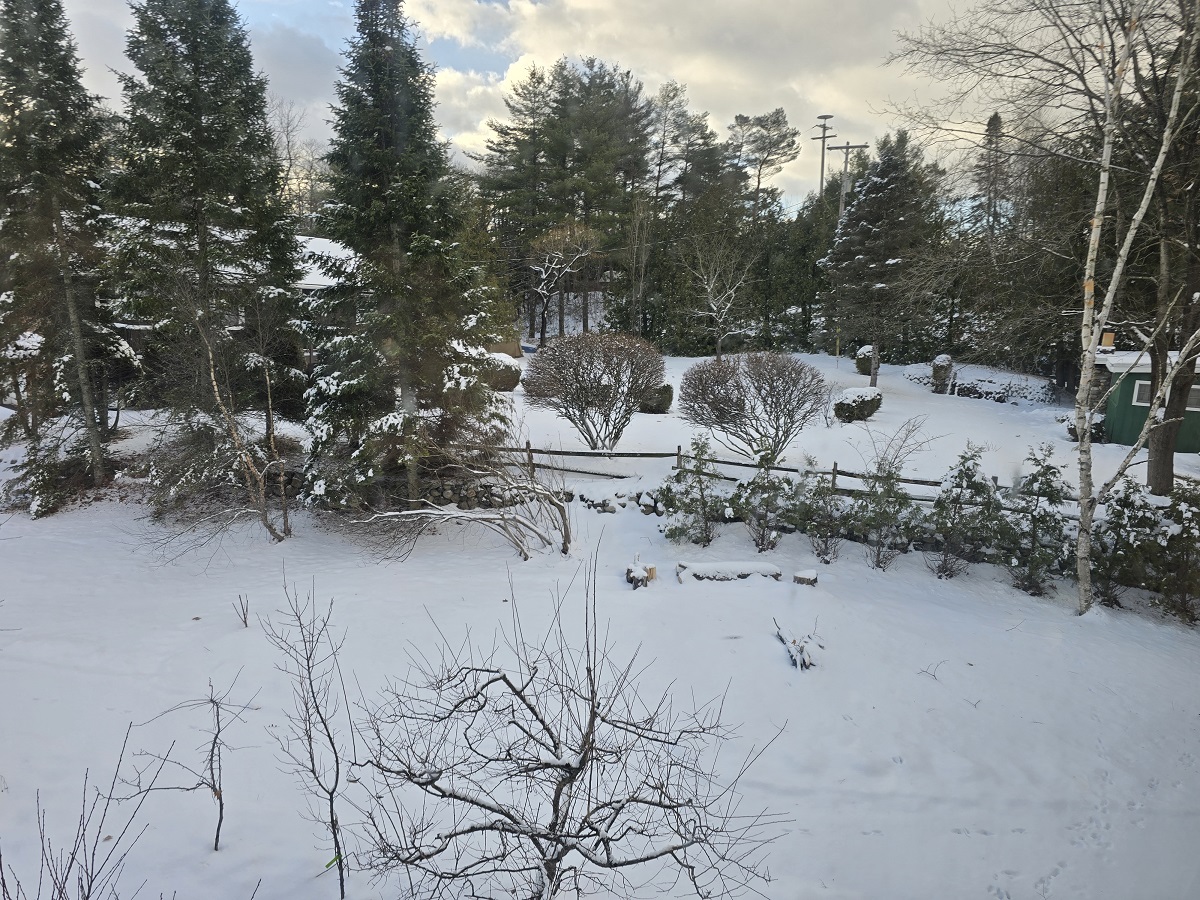 Looking southeast across Underwood yard to snnow on trees