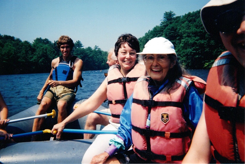 Nate guiding raft in stern with Marjorie in white hat at right