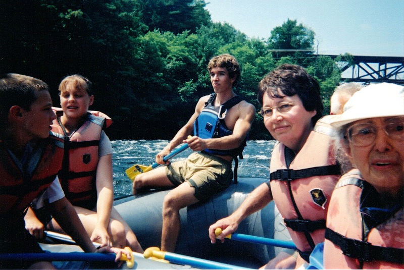 Andy in bow holding yellow paddle, Marjorie two behind him, while Nate in stern guides raft down thickest rapids