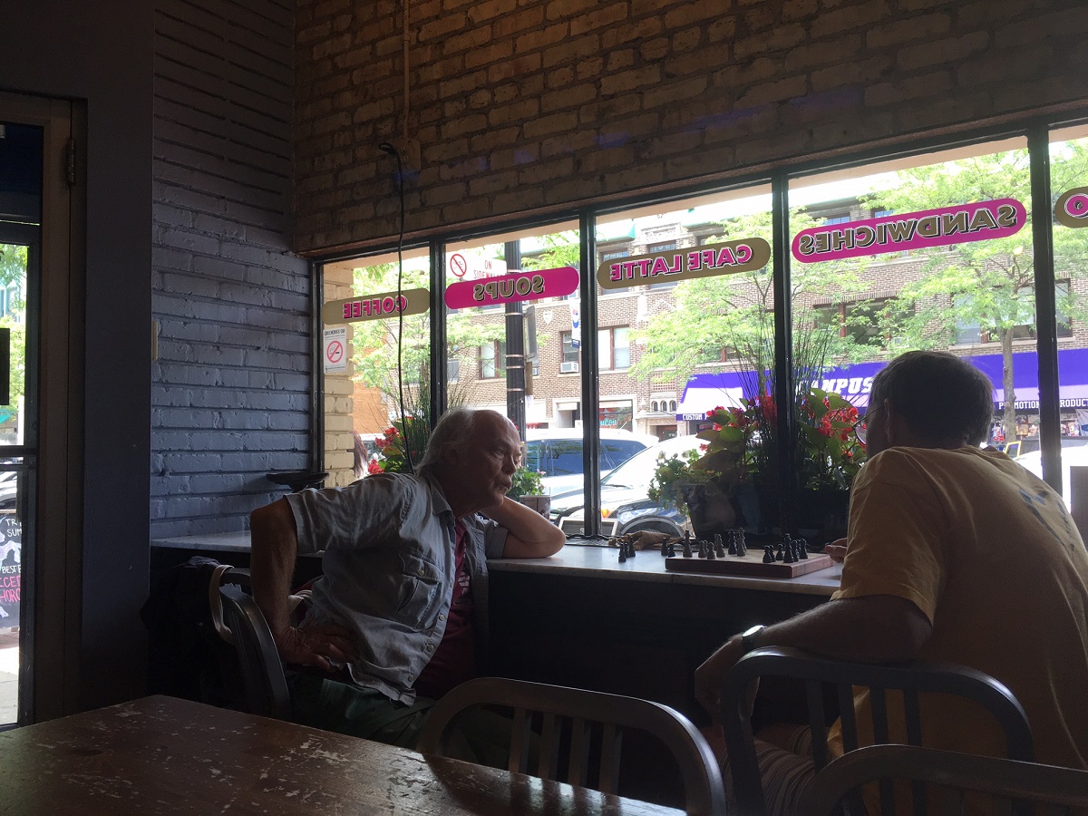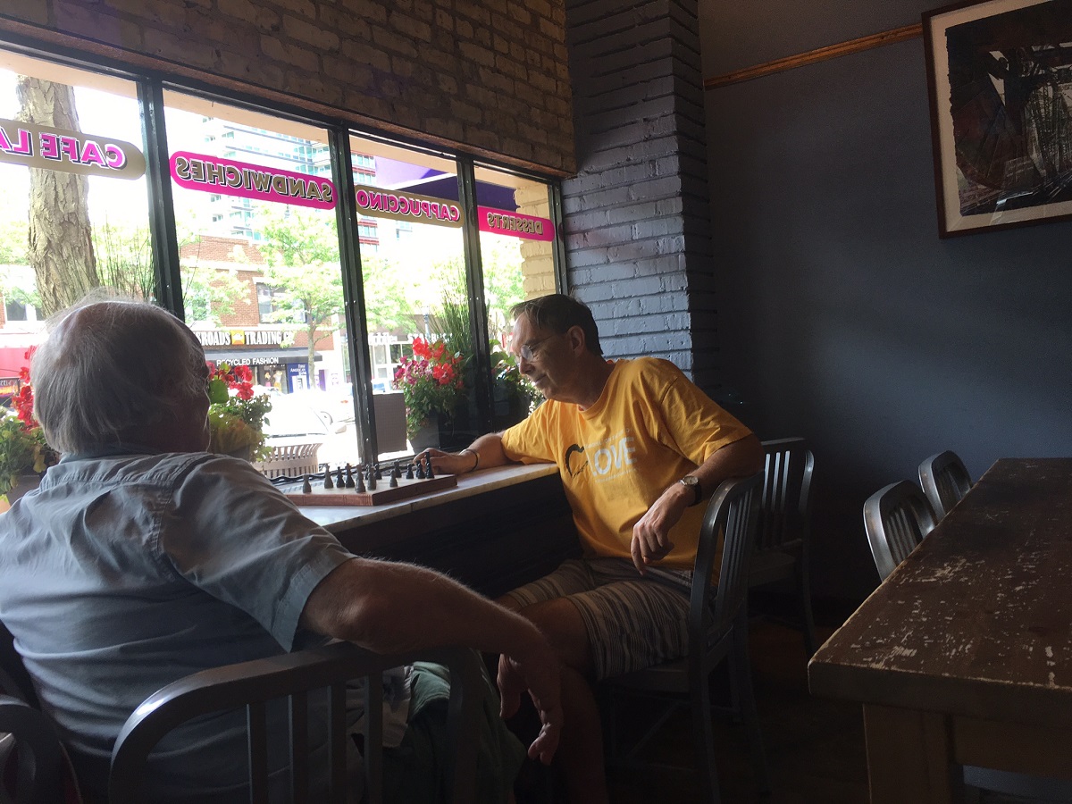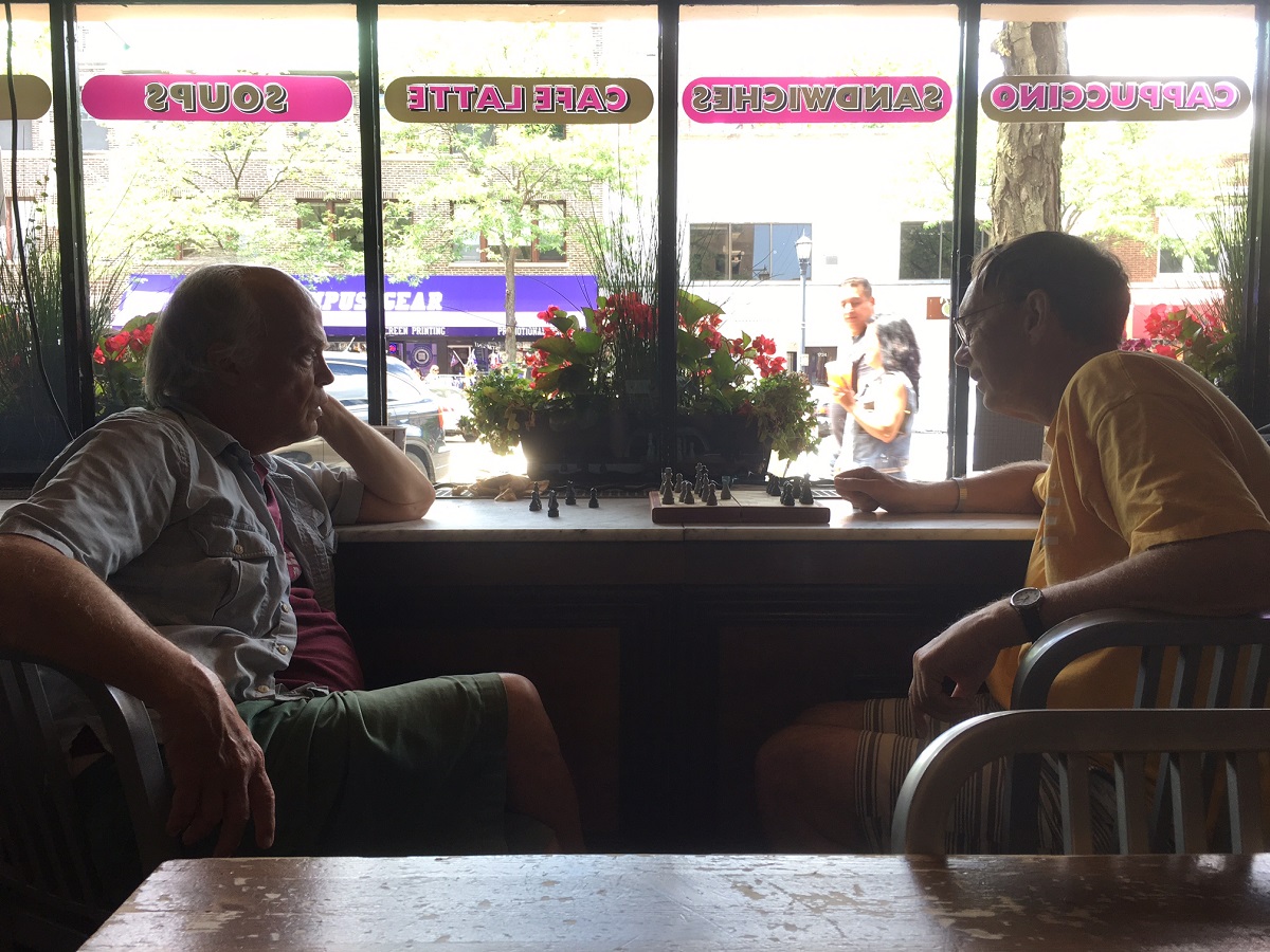 Larry Johnson and Andy playing chess at the Unicorn Cafe, downtown Evanston