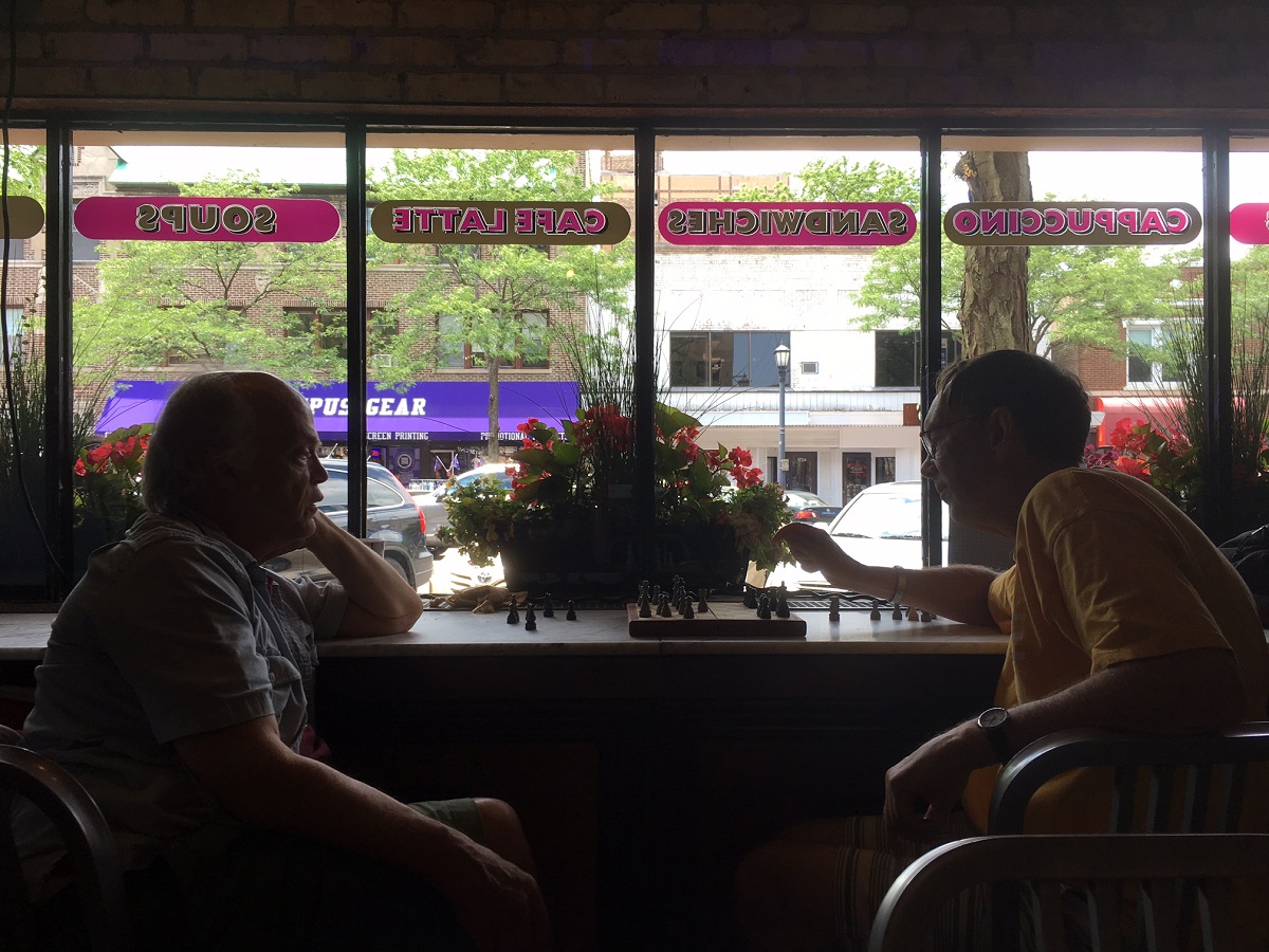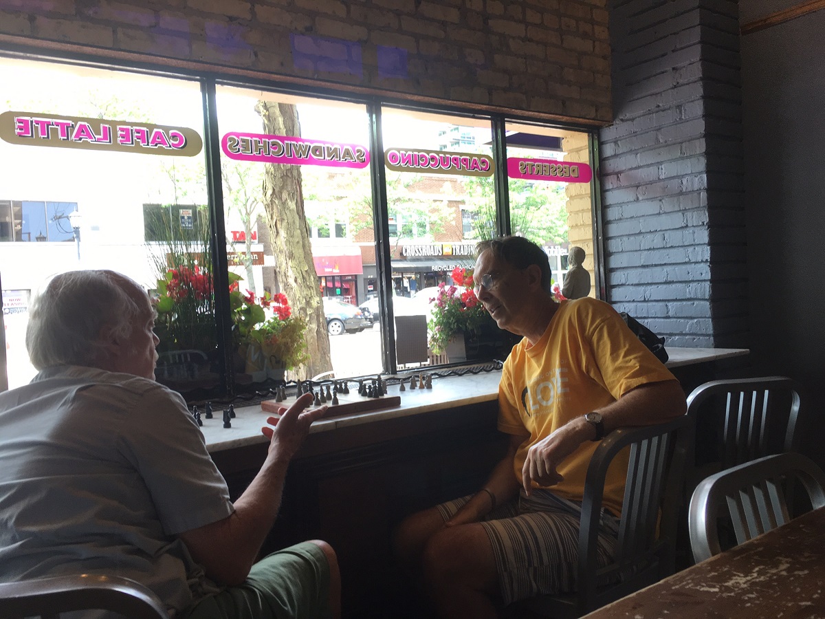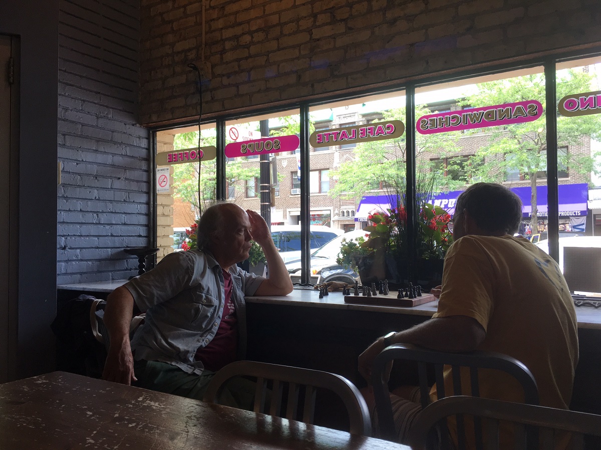 Larry Johnson and Andy playing chess at the Unicorn Cafe, downtown Evanston