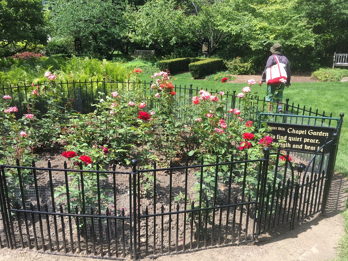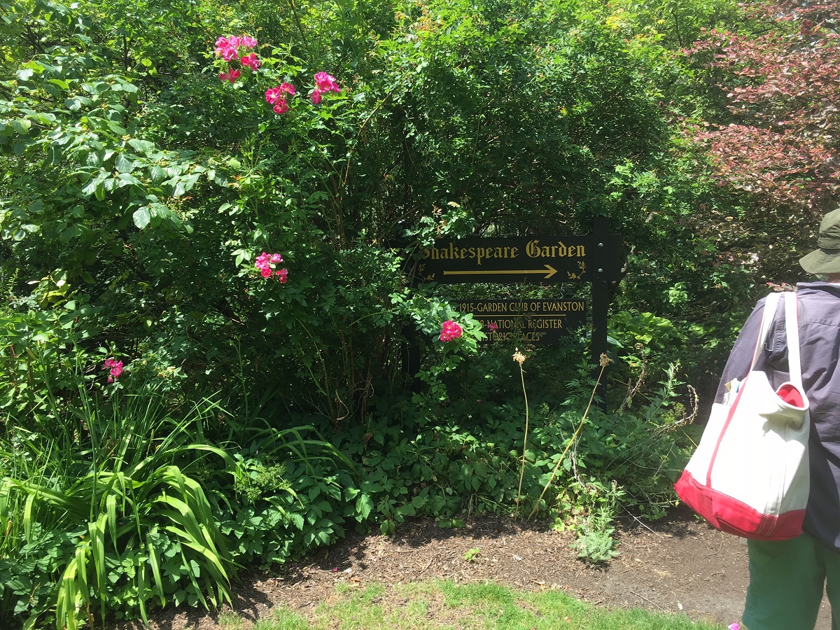 Pink roses and sign for the Shakespeare Garden