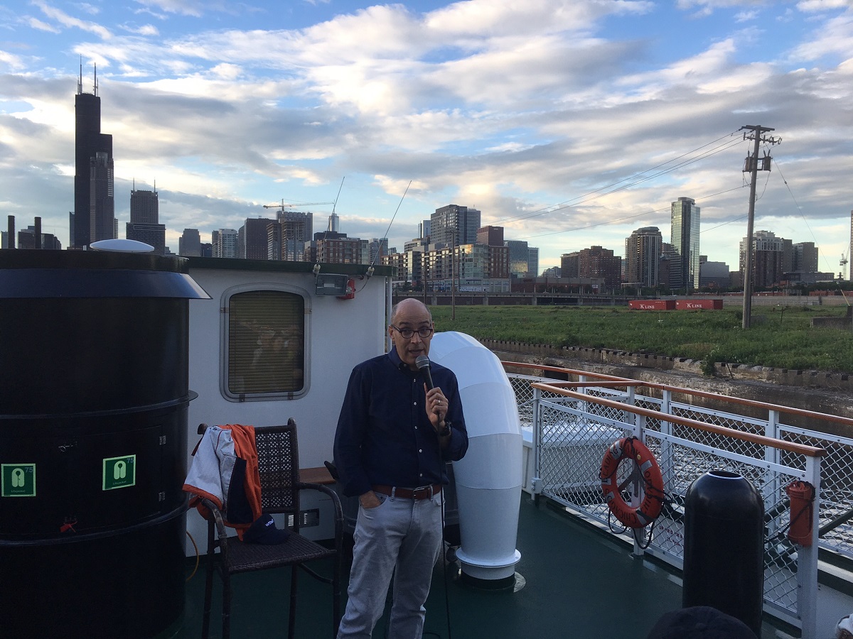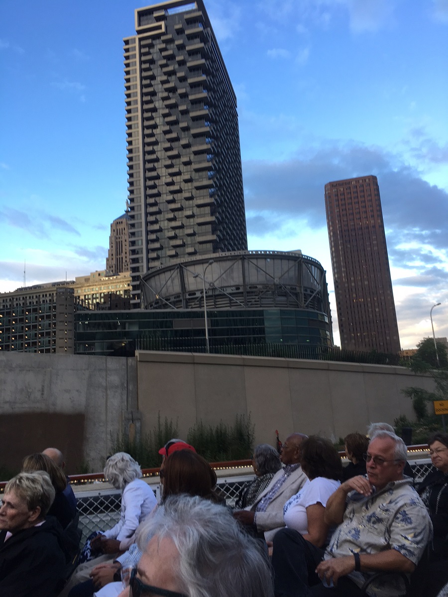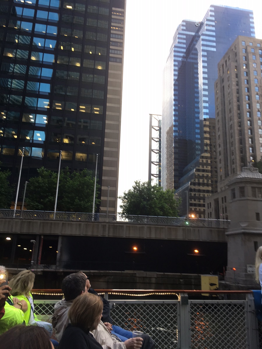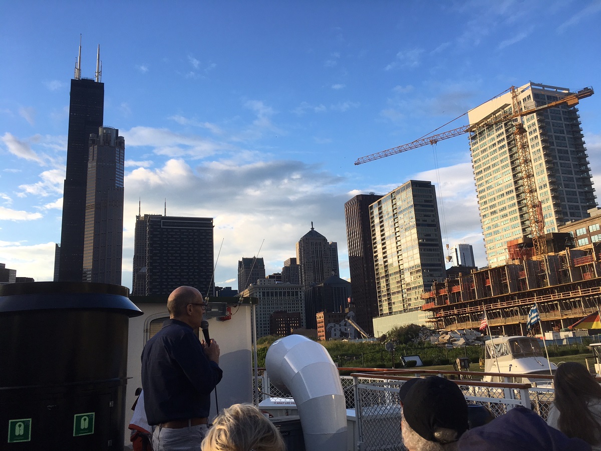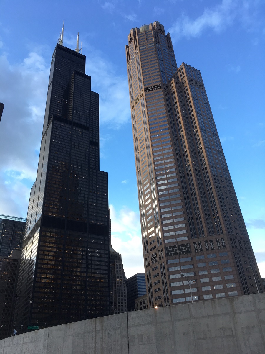 Willis Tower and Board of Trade (with pyramid roof and statue on top) as Geoffrey gives more history