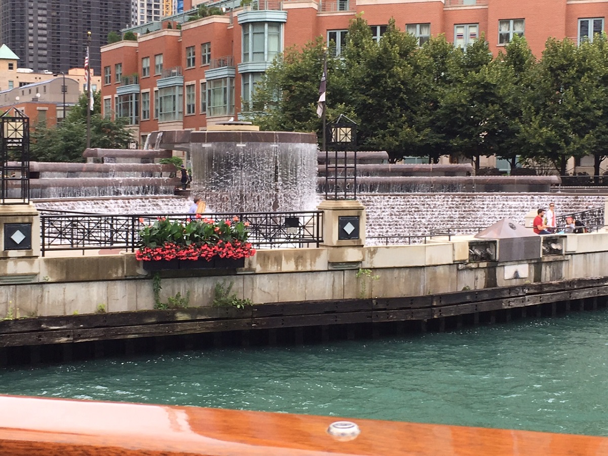 Fountain on north side of river between Michigan Avenue and Lake Shore Drive -- every hour it gushes a stream of water to the south side of the river
