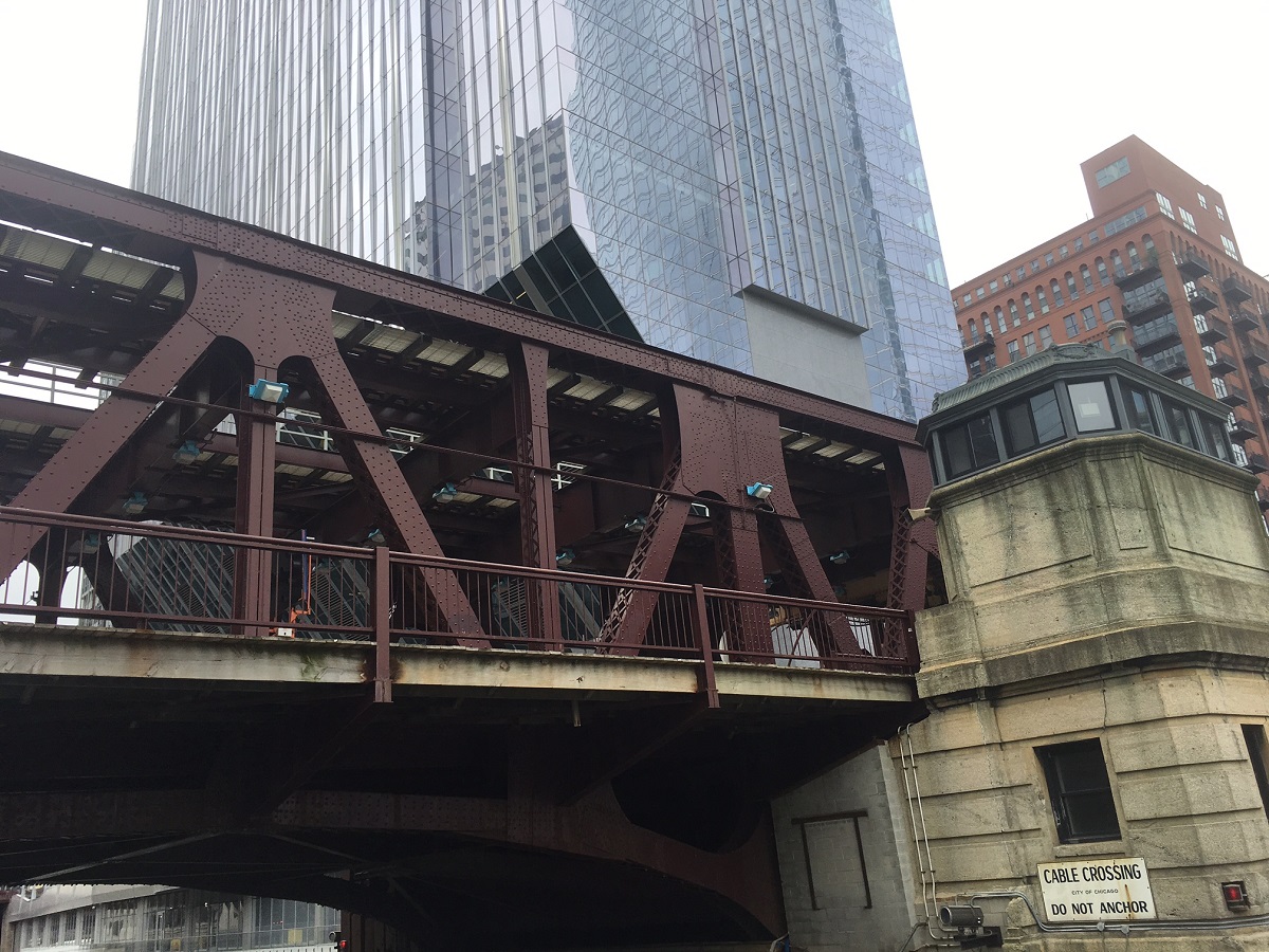 The Lake street bridge and a unique "V" shaped building balancing between railway tracks over their right-of-way -- It has pools of water on its roof pumped to counter-balance so it won't sway too much