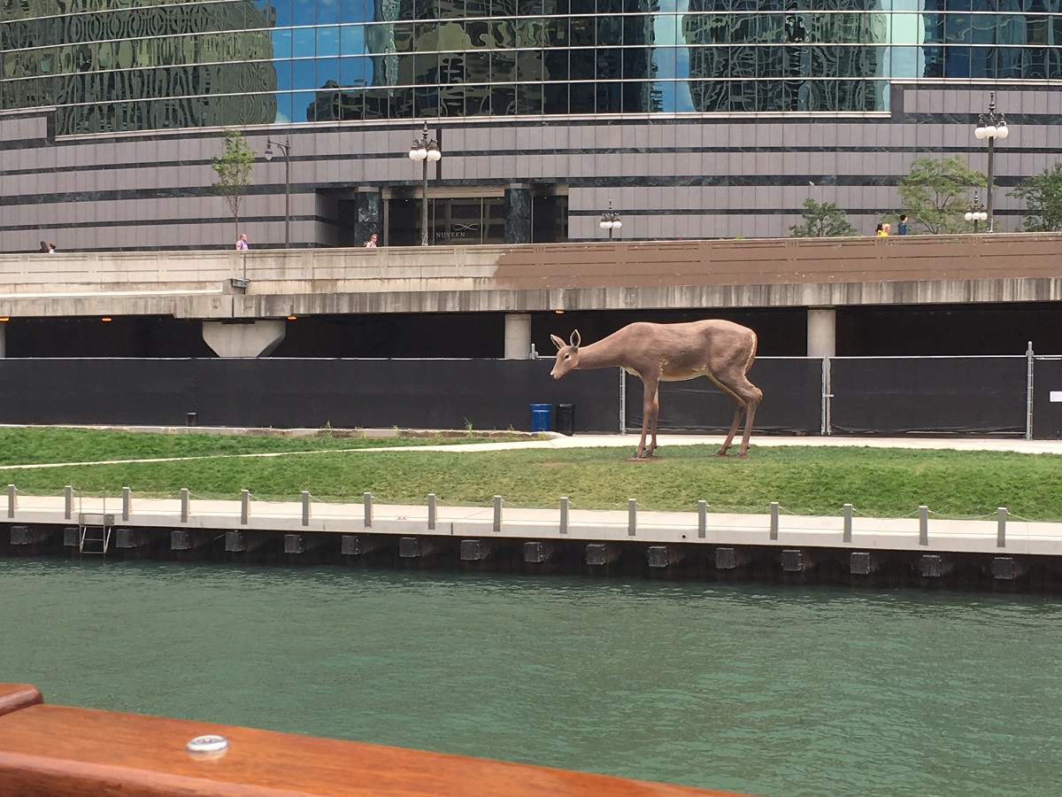 The deer sculpture in front of the beautiful curved Nuveen Building