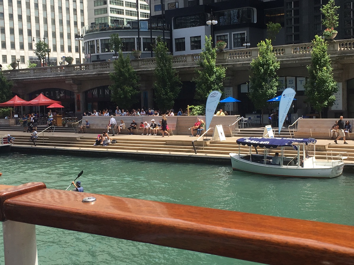 Many shops anolg the river walk Clark, Dearborn and State Streets -- here the walk has docks so many boats can land