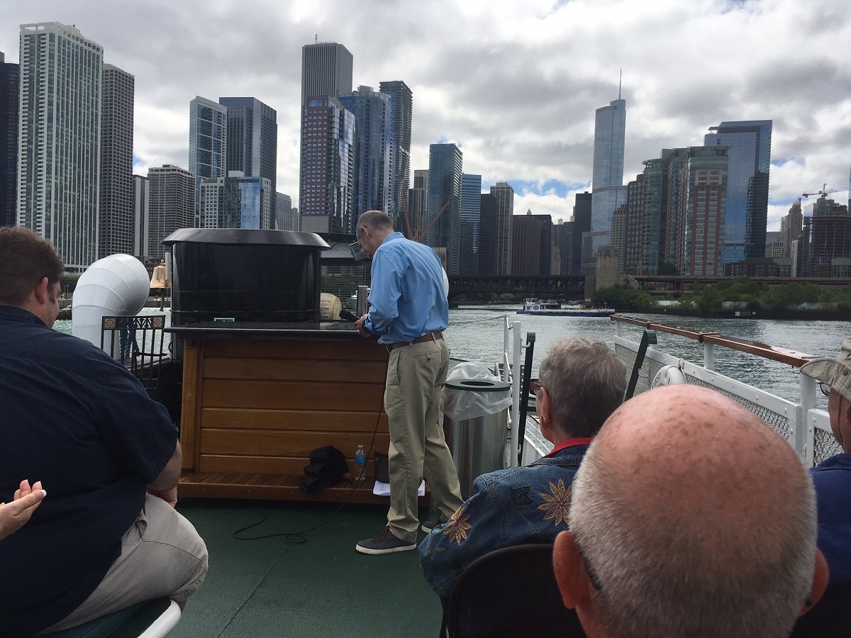 The third loop (after a late lunch) takes us east to Lake Michigan -- Here are many tall buildings, including the unique curved balconey one, and Geoffrey speaking